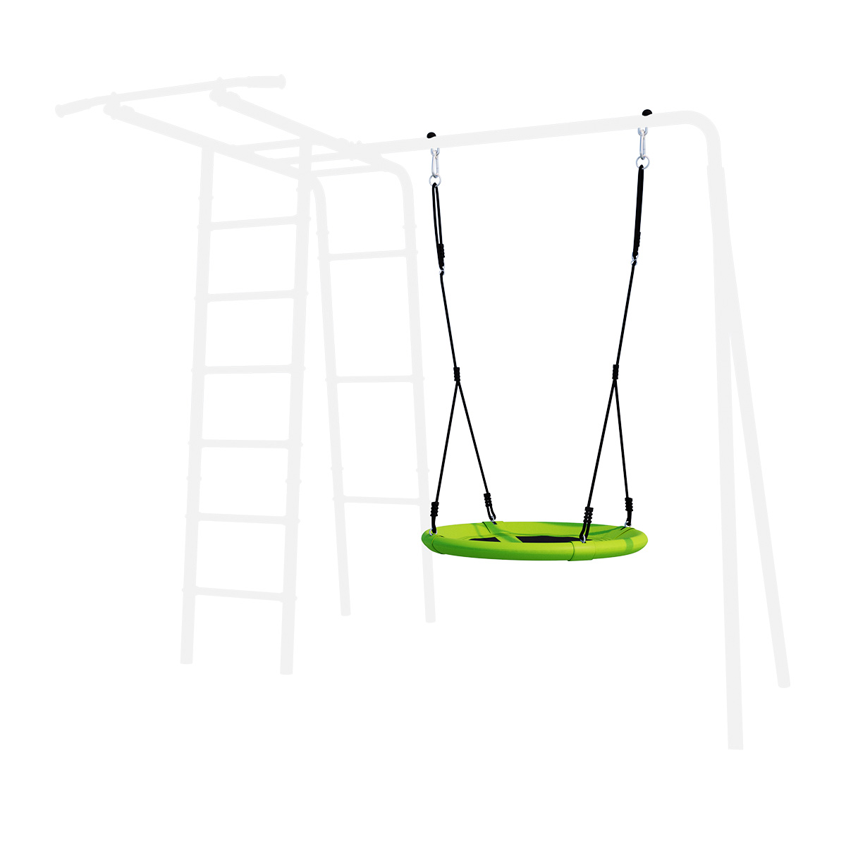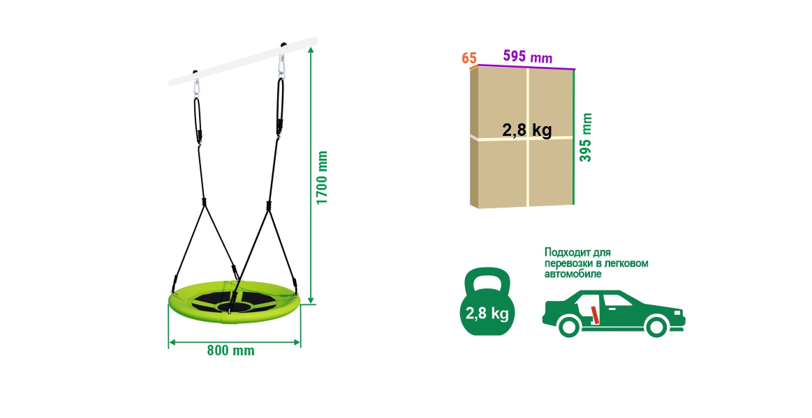 материал оксфорд 600D, тип крепления карабин со втулкой; максимальная высота балки для установки - 210 см; расстояние от нижней точки качелей до земли - 40 см