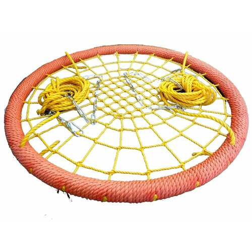 • Высокая прочность материала. Сиденье и оплетка сплетены вручную из кручёного трёх-прядного полиамидного каната 8 мм и устойчиво к растягиванию. Подвесы качелей изготовлены из трёхпрядного каната толщиной 16 мм. Основание качелей выполнено из стальной трубы d 40 мм, толщиной стенки 1,5 мм, окрашено краской для предотвращения коррозии.