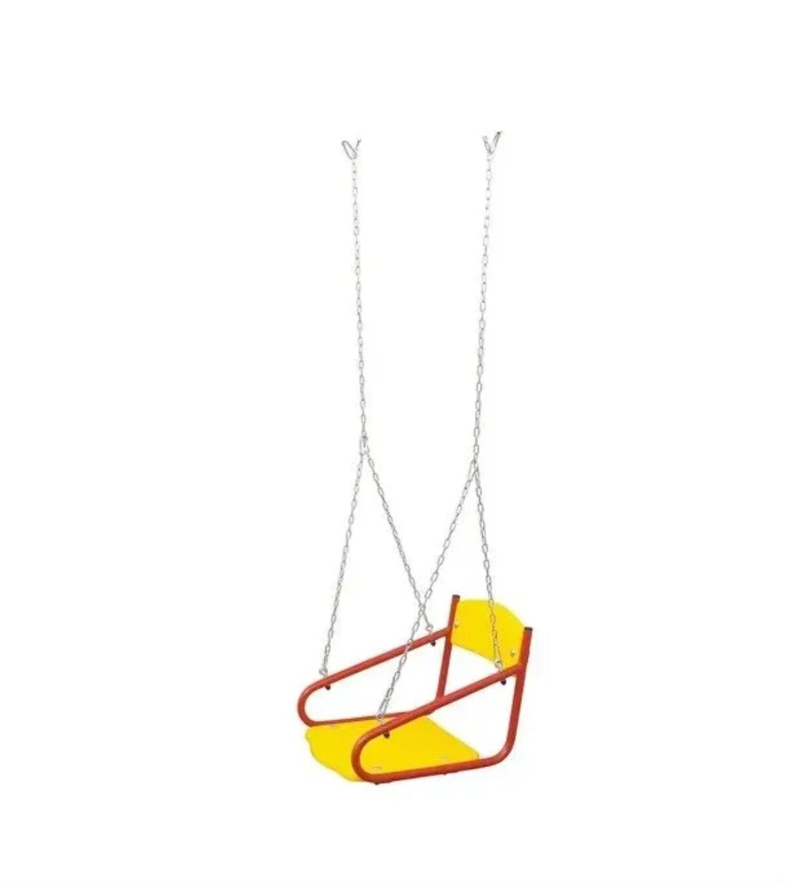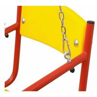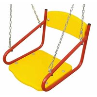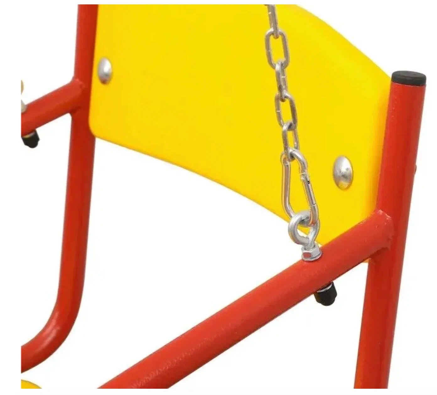 Детские железные качели красного цвета с пластиковым сиденьем и спинкой желтого цвета на цепи. Качелька подвесная подходит для использования как в домашних условиях, так и для детской уличной площадки. Ее можно эксплуатировать в любую погоду т. к. они выполнены из высокопрочного пластика и стали с порошковым покрытием. Сиденье на садовые качели выдерживают нагрузку до 50 кг и предназначены для возраста от 3-ех лет. Ваш ребенок будет счастлив , катаясь на уличных цепных качелях.
