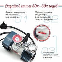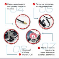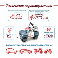 Этот поршневой высокопроизводительный компрессор отлично справится с шинами легковых автомобилей, мотоциклов, велосипедов и легкого коммерческого транспорта. Устройство имеет компактные размеры и незначительный вес. Питается от штатного гнезда прикуривателя автомобиля с напряжением 12 вольт с подключением к электросети автомобиля через гнездо прикуривателя и защитой от короткого замыкания на проводе. Сам провод питания после применения устройства аккуратно наматывается на ножки. На корпусе компрессора установлен механический манометр с двумя шкалами измерения: «Атм» и «PSI», а специальный клапан-дефлятор поможет отрегулировать давление в шинах. Благодаря наличию переходников компрессор можно использовать также для накачки воздушных матрасов, игрушек и мячей. Компрессор прячется в удобную сумку для хранения и переноски.