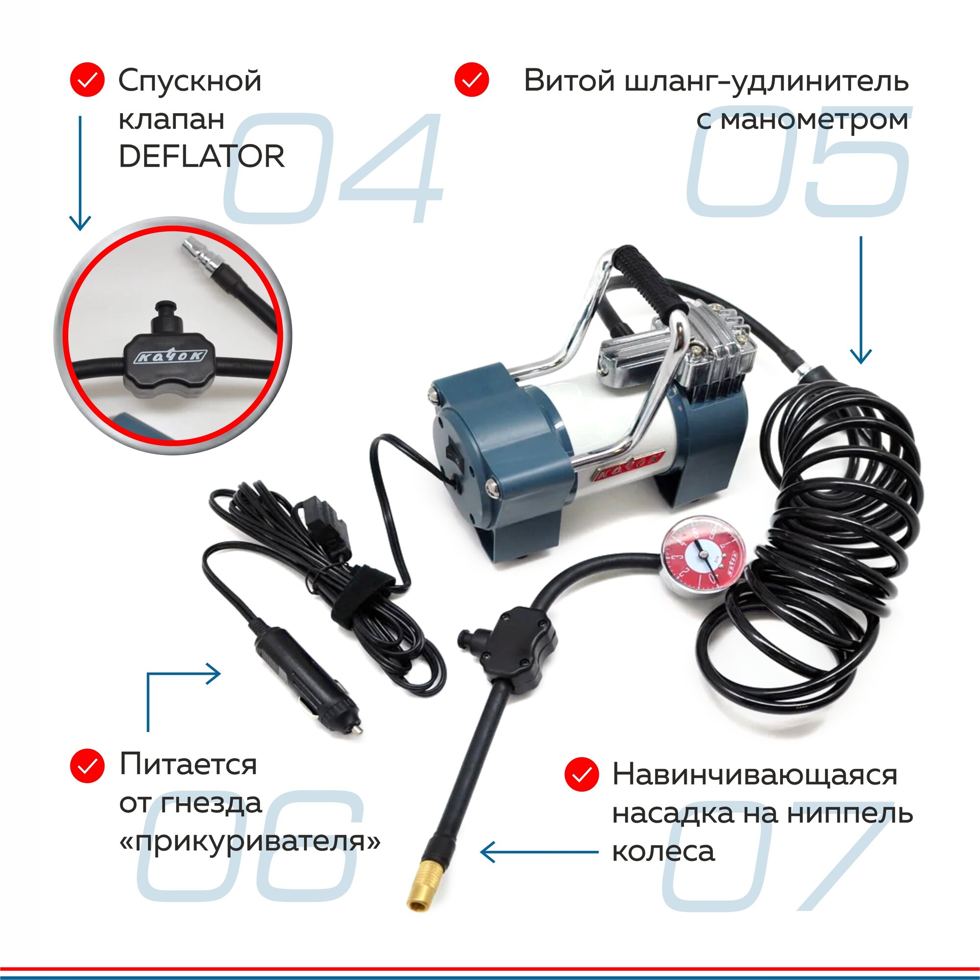 защита от короткого замыкания, защита от перегрева, навинчивающийся наконечник, спускной клапан (дефлятор)