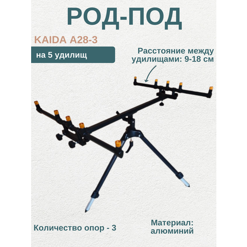 Предлагаем вам Род под A09-5 от фирмы Kaida. Род под это современная подставка для фидерных и карповых удилищ, которую используют для всех видов донной ловли на такую рыбу как карп, сазан лещ и другие. Род под часто используют в комплекте с сигнализаторами поклевки, которые легко вкручиваются в специальную резьбу. Основные преимущества род пода перед обычными подставками для удочек, это то что его без проблем можно установить на деревянном помосте и на любой другой твердой поверхности. Так же род под вмещает сразу несколько удилищ, выполнен из более дорогих и долговечных материалов, регулируется по высоте и длине. Бренд Kaida зарекомендовал себя на рынке как производитель качественных и в то же время относительно не дорогих товаров для рыбалки. Продукцию бренда приобретают те, кто не желает переплачивать за именитые европейские бренды, а привык покупать товары по соотношению цены и качества, компания работает так же и над дизайном своих изделий, за что полюбилась многим рыболовам любителям и профессионалам. -Количество удилищ - 5 -Количество ног - 4 -Вес род-пода - 2400 г -Длина 80 - 130 см Ширина Buzz Bar: 64 см Расстояние между удилищами: 16 см Количество опор: 4 шт; Механизм фиксации: Зажимной; Диаметр резьбы 3/8'. Насадки 5 штук.