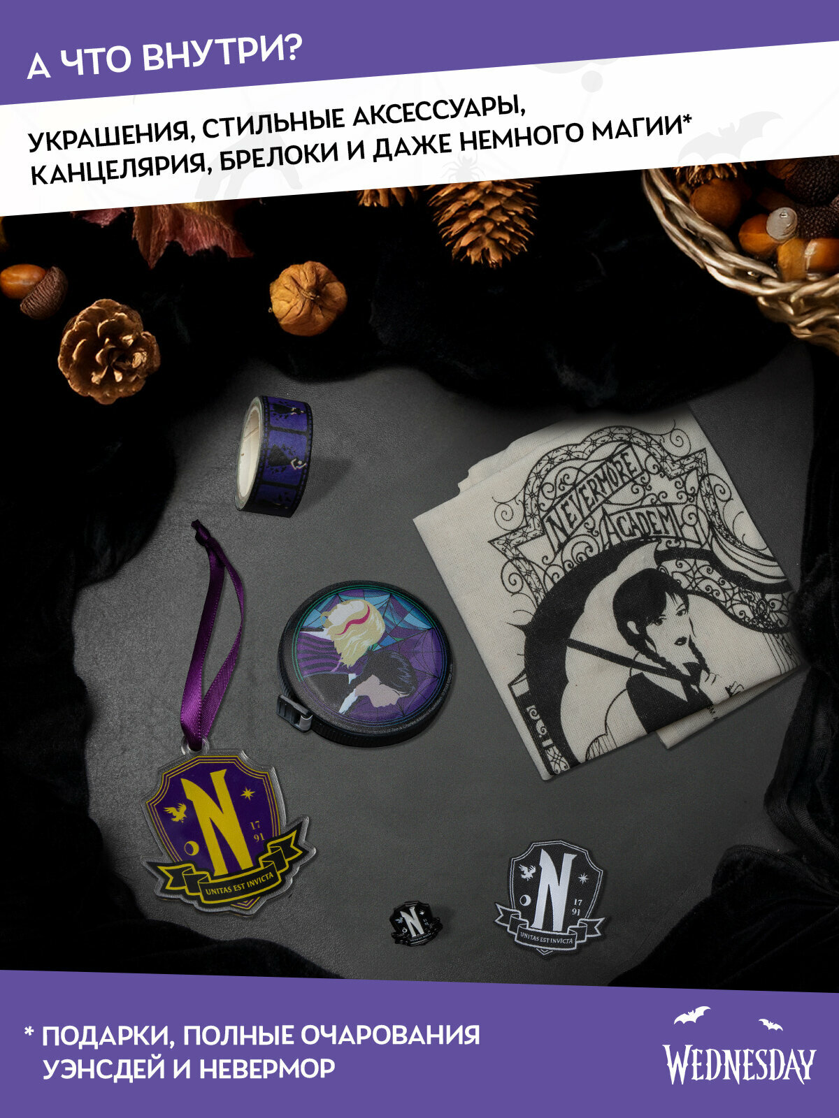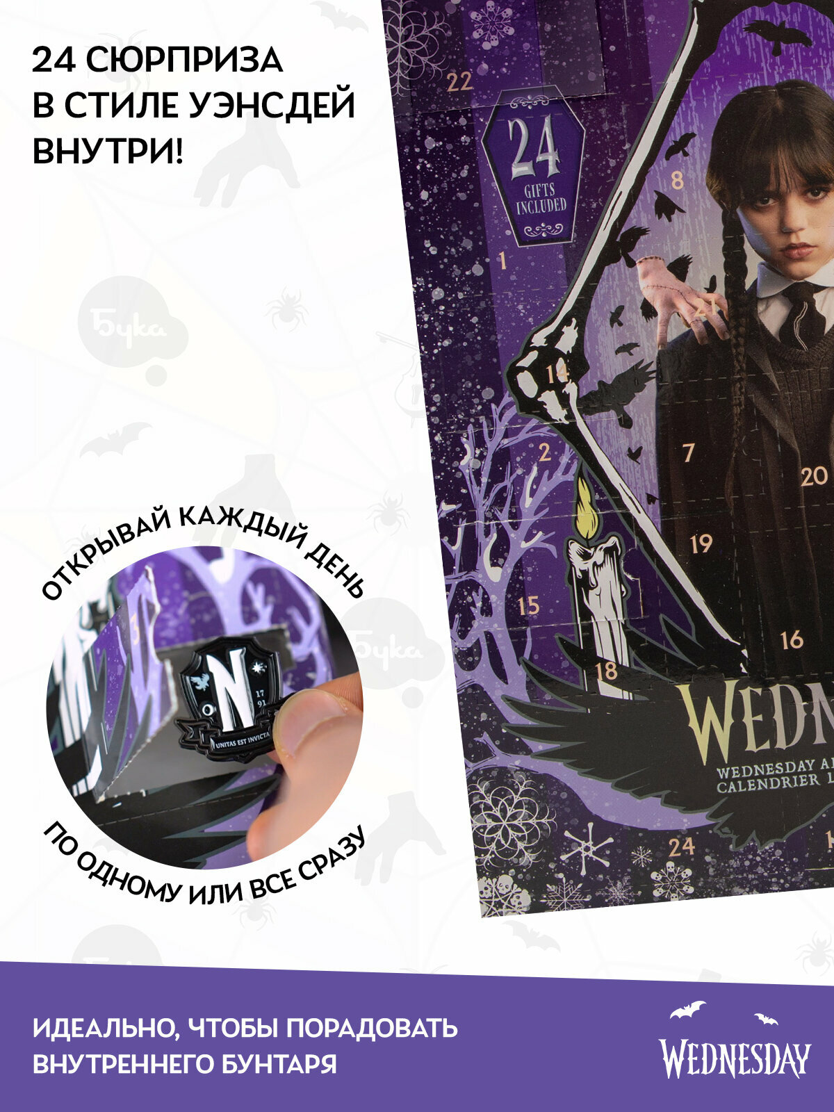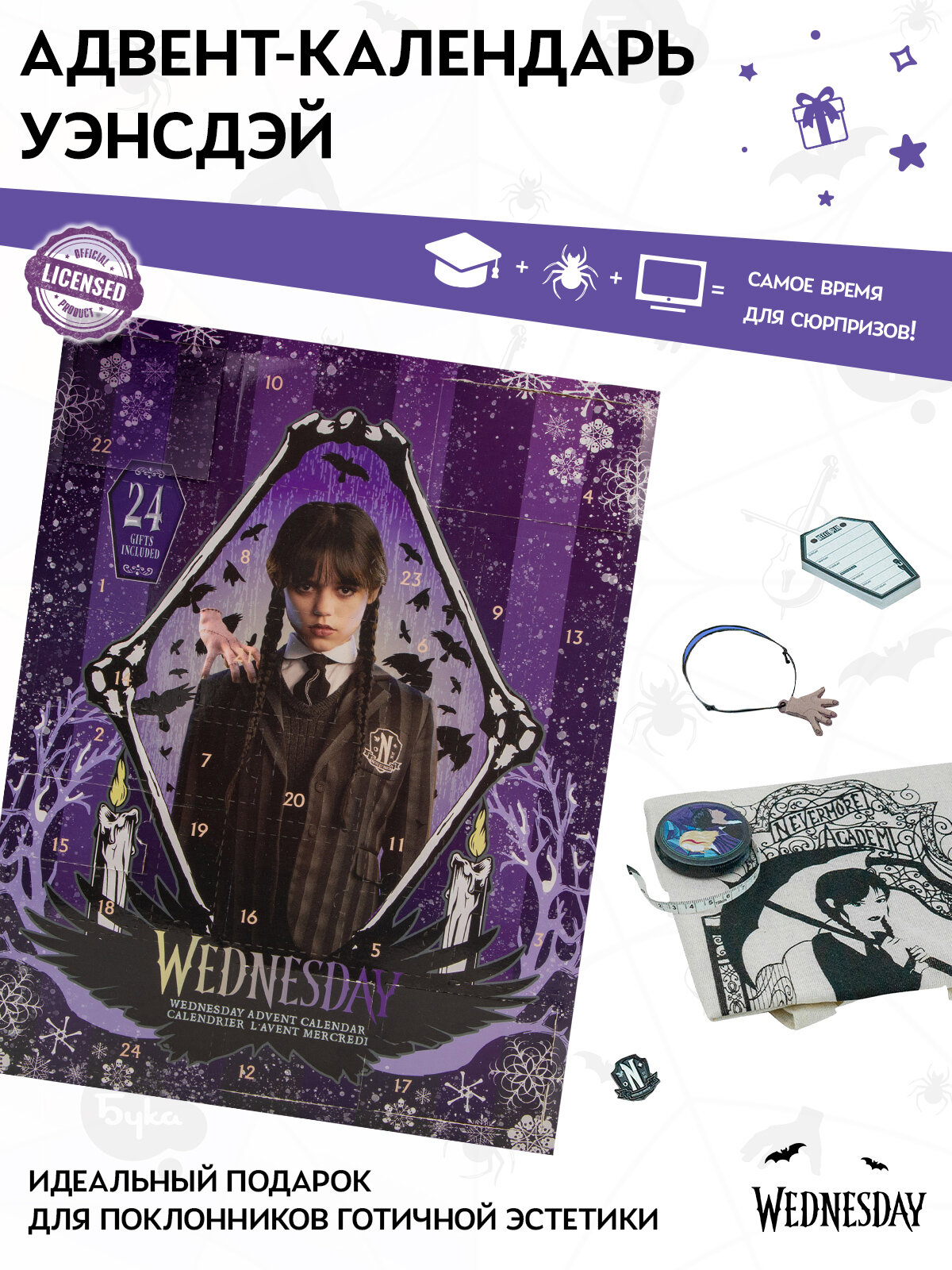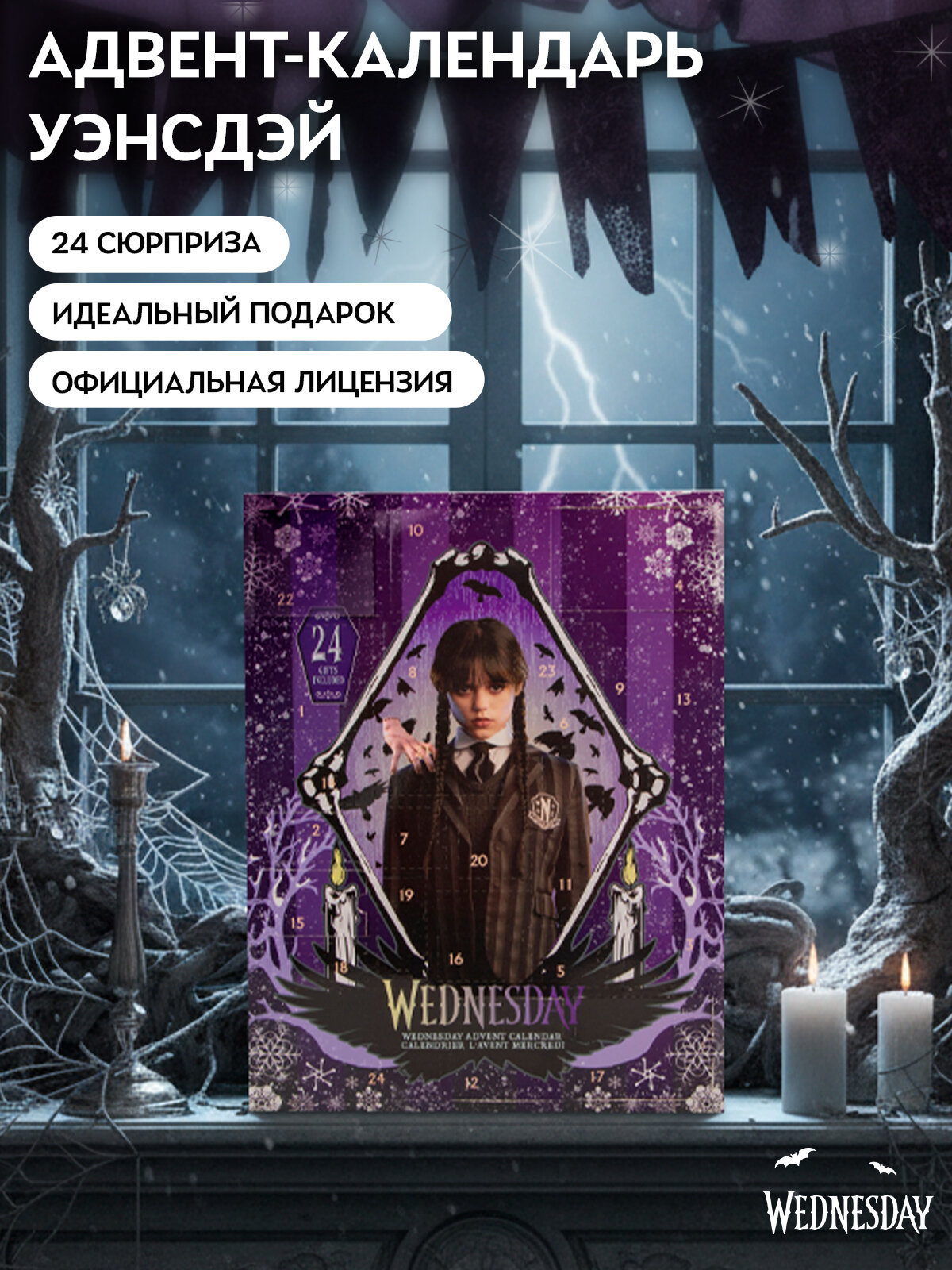 Скорый выход нового сезона — отличный повод снова погрузиться в мир Уэнсдэй. Этот календарь станет персональной разминкой перед возвращением в Невермор. Открывайте по одному сюрпризу в день или распакуйте всё сразу — вы сами выбираете темп.