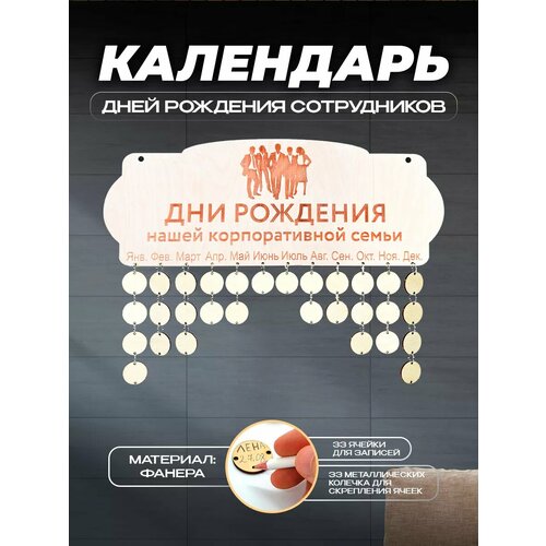 С этим уникальным календарем, вы не пропустите дни рождения коллег . Благодаря календарю, условному форматированию вы получаете напоминания о днях рождения. Данный календарь дней рождения коллег выполнено из натуральной березовой фанеры толщиной 3 мм ( бежевый цвет). Сверху календаря есть два отверстия для подвешивания на стене или другой поверхности. Дополнительные ячейки для календаря вы можете найти в нашем магазине, артикул 48840038.