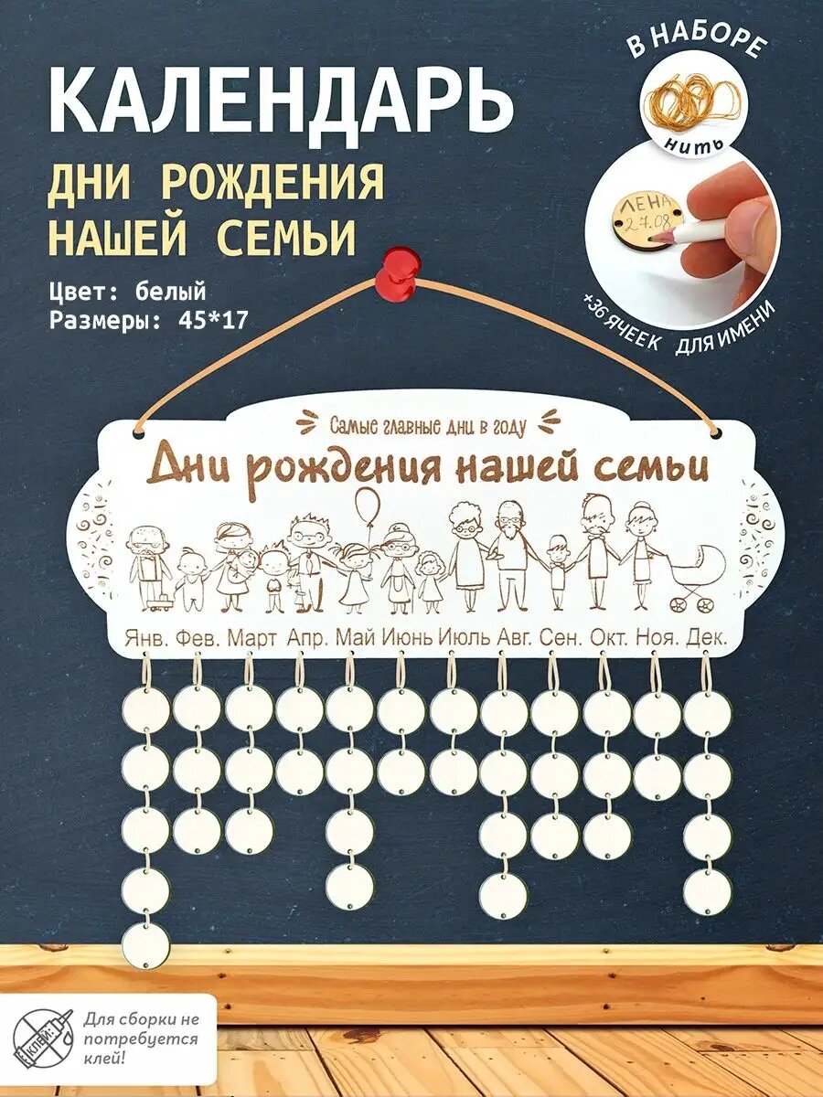 По многочисленным просьбам новинка! Календарь дней рождения семьи, друзей и близких людей. Мы поняли, что наши календари не оставляют вас равнодушными и доработали их. С этим уникальным календарем, вы не пропустите дни рождения семьи, он станет вашим незаменимым помощником, который напомнит про все дни рождения и важные мероприятия. Наш календарь - отличный, универсальный, оригинальный подарок ручной работы. Благодаря условному форматированию вы получаете напоминания о днях рождения. Вечный календарь выполнен из материала хдф с лазерной гравировкой, закруглениями. Сверху есть два отверстия для подвешивания на стене или другой поверхности. Дополнительные ячейки для календаря вы можете найти в нашем магазине, аритикул 48840038