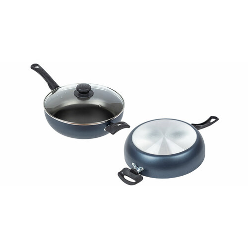 Сотейник Сатин диаметром 26 см со стеклянной крышкой – универсальная, легкая и надежная посуда на каждый день по доступной цене. Европейское антипригарное покрытие внутри надежно защищает еду от пригорания, внешний слой декоративного покрытия также имеет антипригарные свойства, легко моется, долго сохраняет аккуратный вид и насыщенный синий цвет. Прочный корпус из штампованного алюминия с эргономичной бакелитовой ручкой делает использование сотейника удобным и безопасным. Жаропрочная крышка помогает удерживать температуру внутри сотейника для сохранения сочности и полезных свойств продуктов. Сотейник диаметром 26 см комплектуется второй поддерживающей ручкой. Сотейник Сатин подойдет для легкой обжарки, тушения и подогрева любых блюд повседневного меню: мяса, рыбы, овощей, гарниров и полуфабрикатов на электрической или газовой плите.