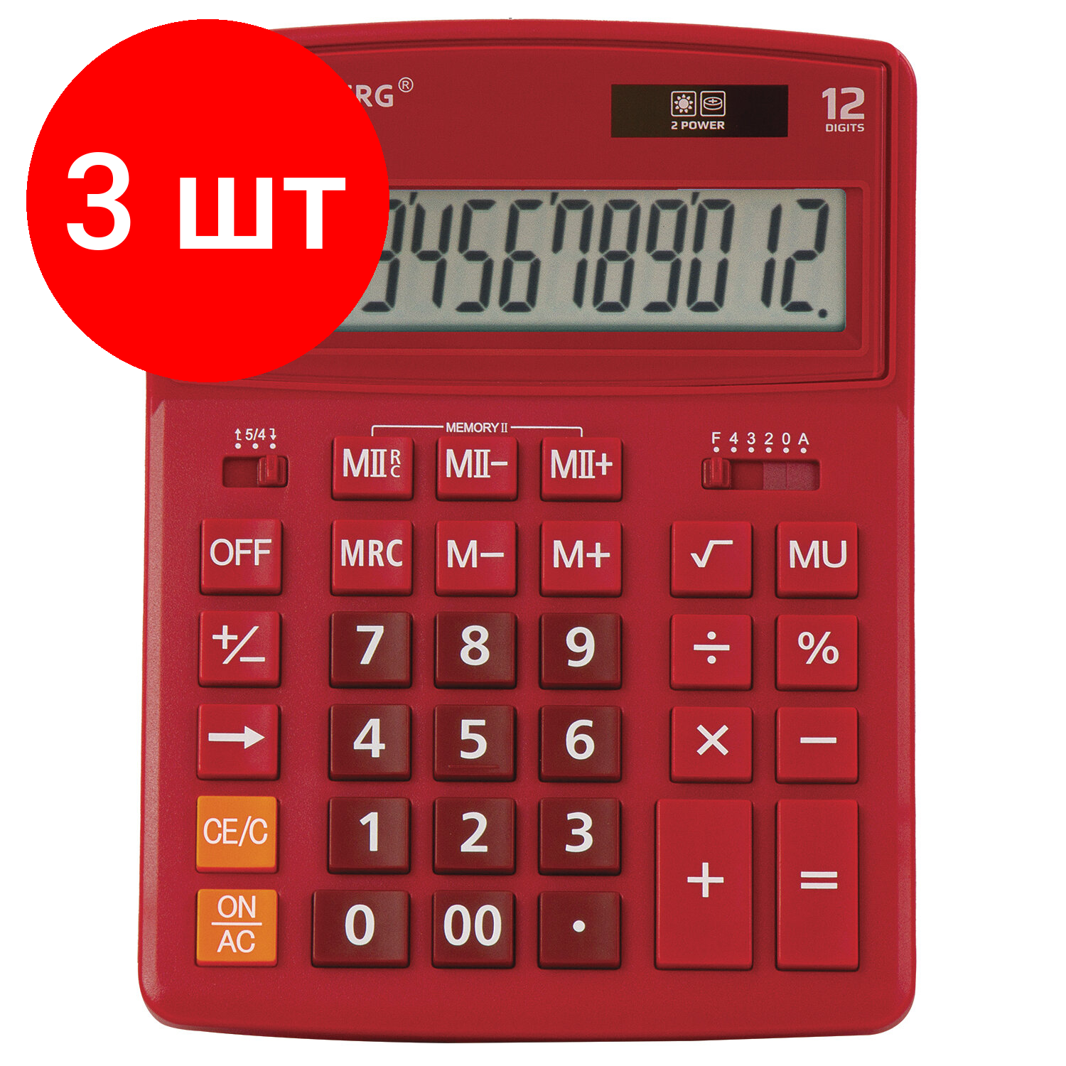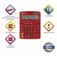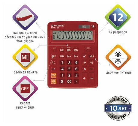Внимание! Товар продается комплектом:[Калькулятор настольный BRAUBERG EXTRA-12-WR (206x155 мм), 12 разрядов, двойное питание, бордовый, 250484] X 3 шт. Настольный калькулятор BRAUBERG EXTRA-12-WR. Большой дисплей с увеличенным углом обзора, устойчивый корпус и клавиатура с цветной дифференциацией для эффективной работы с максимальным комфортом.