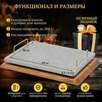 1. Камень-гриль 400 х 300 мм с гладкой поверхностью камня, ручки из нержавеющей стали. По периметру имеется канавка для стока масла и жира.
