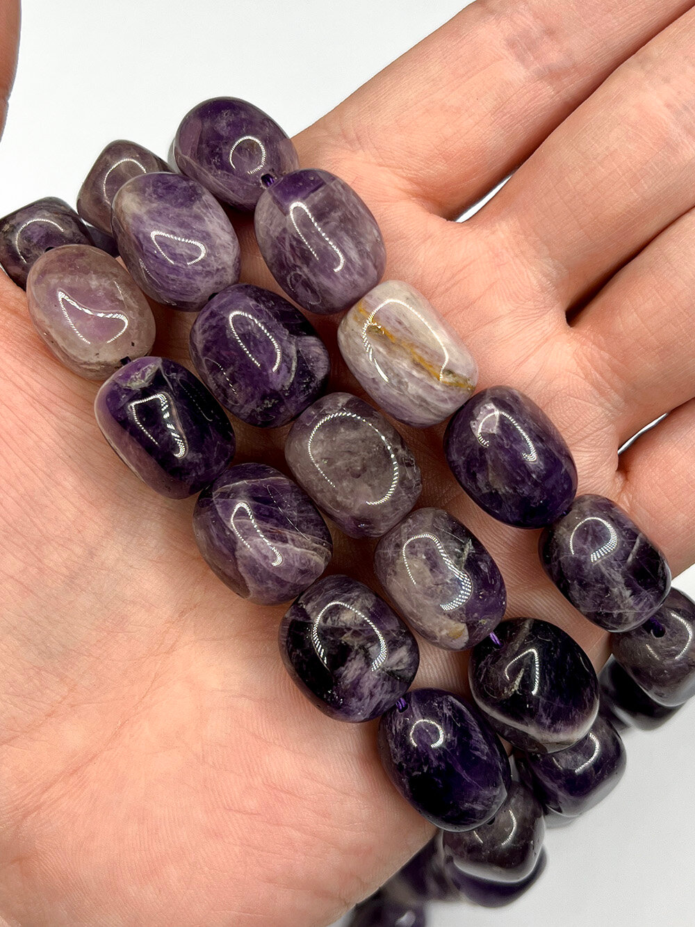 Добавьте изысканности вашим изделиям с аметистовыми бусинами галтовка размером 15-18х12 мм. В каждой нити представлено около 22 бусин, выполненных из натурального камня, что делает их идеальными для рукоделия и создания уникальных аксессуаров. Эти крупные бусины излучают мягкий фиолетовый цвет, придавая вашим проектам особый шарм и утонченность.