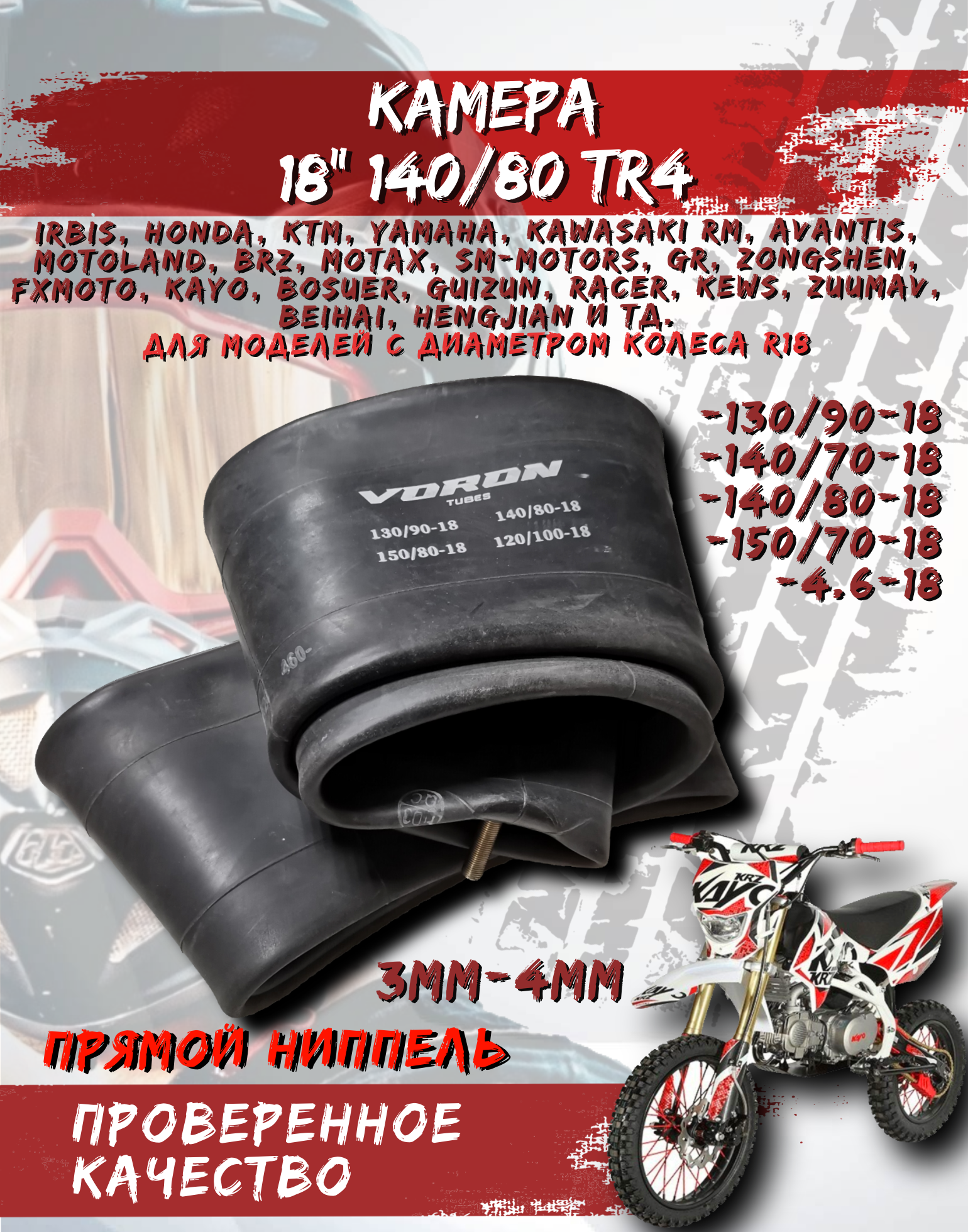 Камера 18" 140/80 TR4 (3mm-4mm) VORON TUBES - это усиленная задняя камера, разработанная специально для мопедов эндуро, внедорожных мотоциклов, питбайков и других видов мототехники.