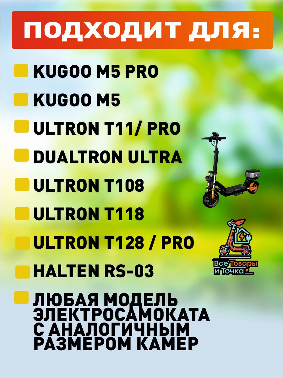 Камера совместима с широким спектром моделей, включая Kugoo M5, Ultron T11, Ultron T108, Ultron T118, Ultron T128, Halten RS-03, а также любые другие электросамокаты с колесами 11 дюймов. Приобретая данную камеру по указанной цене, вы получаете надежное решение для вашего электросамоката, которое обеспечит комфортную и безопасную езду на длительное время.