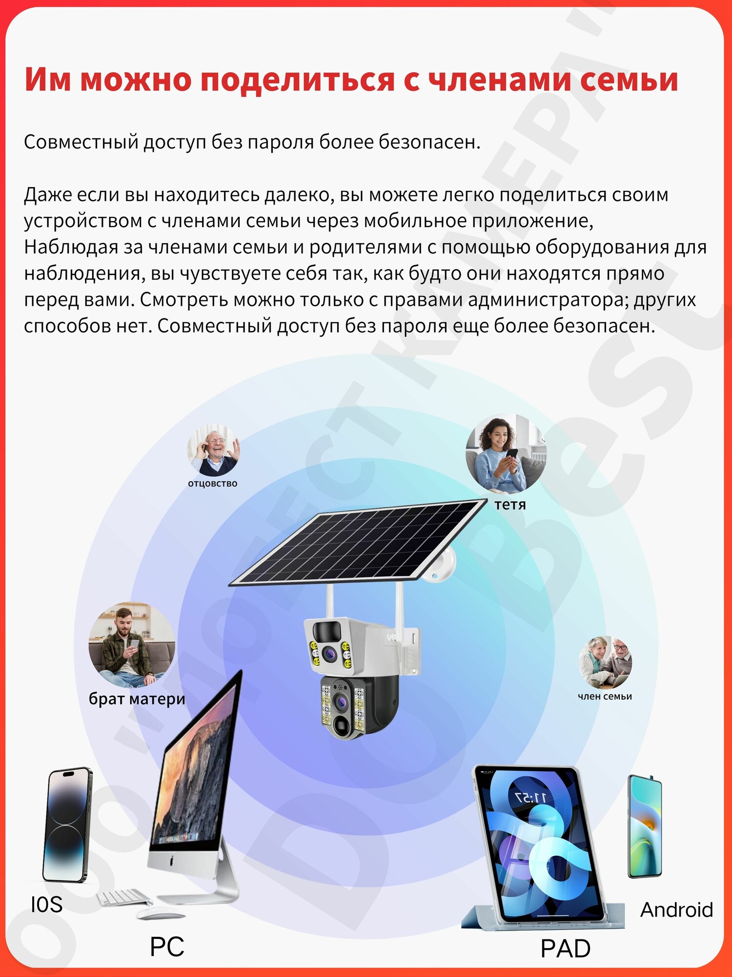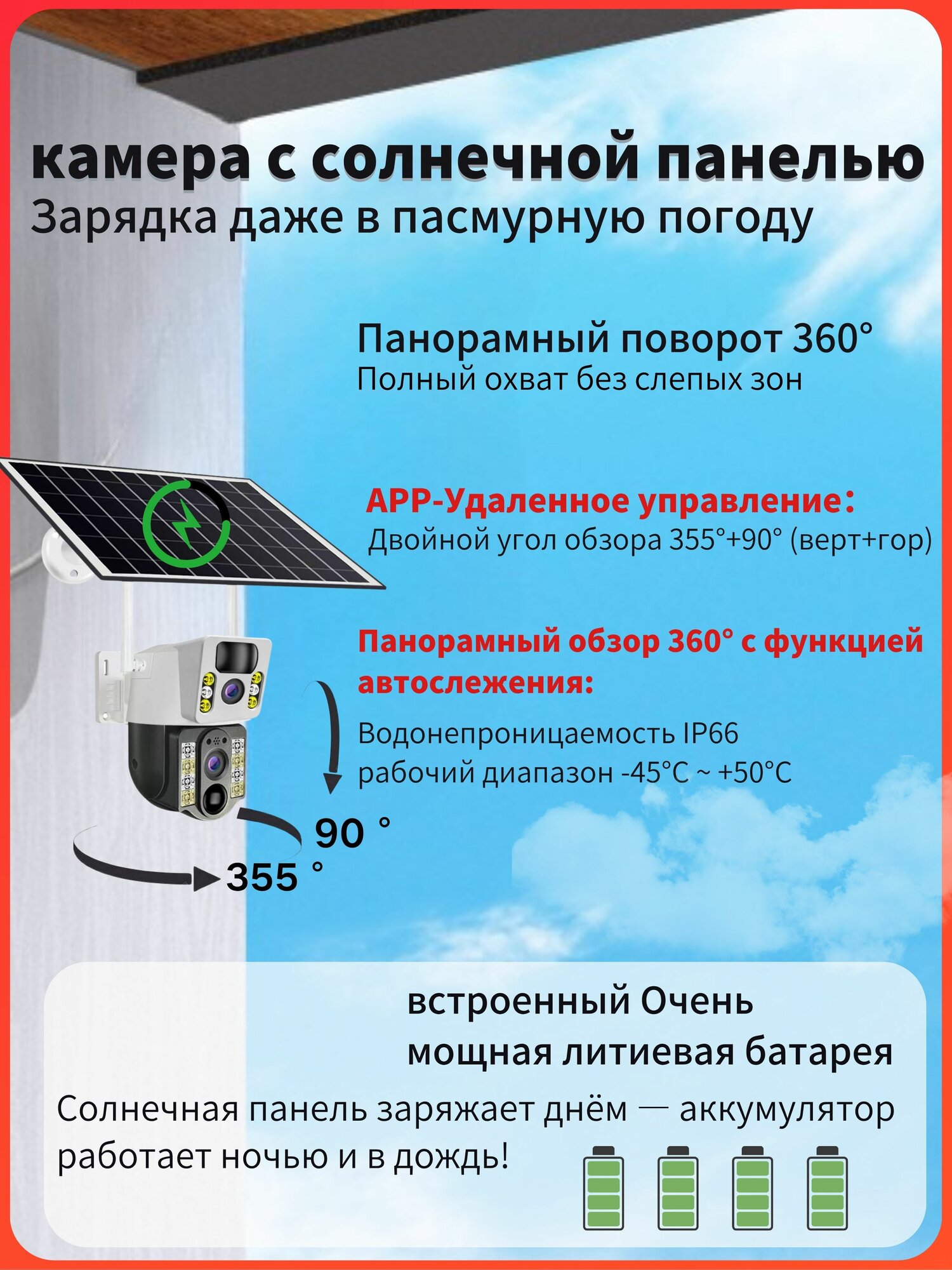 Это уличная камера видеонаблюдения на солнечной батарее, Wi-Fi версия (работает через роутер), без SIM-карты, беспроводная. Основные преимущества: ✔ 2 объектива — качество изображения 4MP HD, полное отсутствие слепых зон. ✔ PTZ (поворотная камера) — 360° обзор для безопасности без слепых зон. ✔ Сигнализация — световая вспышка, звуковое оповещение + push-уведомления. ✔ Запись видео — сохраняйте все важное!✔ Просмотр через телефон — удаленный доступ для всей семьи с общим доступом. ✔ Солнечная батарея — экологично и экономично, заряжается даже при слабом свете. ✔ Двусторонняя аудиосвязь — встроенный динамик и микрофон. ✔ Трекинг движения — обнаружение и отслеживание людей. ✔ Защита от непогоды: Водонепроницаемый корпус (IP66), надежная при любой погоде. ✔Запись видео: используйте microSD карту (до 128GB) или облачное хранилище (по подписке) – выбор не влияет на работу камеры Идеально для: дома, уличного видеонаблюдения, дачи, квартиры, двора, подъезда или гаража. Круглосуточная защита без слепых зон! Обновите систему безопасности и пользуйтесь удобством современных технологий!