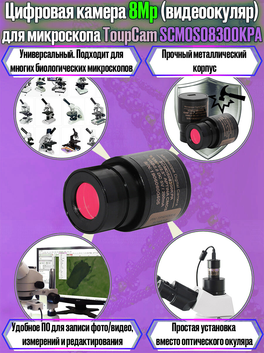 Видеоокуляр ToupCam SCMOS08300KPA – цифровая CMOS-камера для микроскопа на базе сенсора формата 1/2,8" с разрешением 3840x2160 пикселей (скорость передачи данных составляет 30 кадров в секунду на максимальном разрешении).