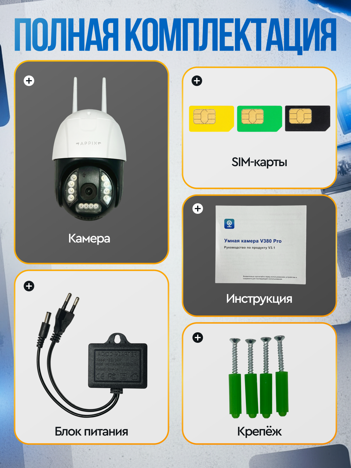 Уличная камера видеонаблюдения с сим картой Appix - идеальное решение для обеспечения безопасности вашего дома или офиса. ✔Возможность подключения камера наблюдения как от сим карты, так и от wifi роутера по сетевому проводу. Добавляйте камеру в приложении v380pro. ✔ Установка в любом месте: В комплекте есть блок питания с проводом 3 метра, что позволяет подключить и установить ip камеру видеонаблюдения в удобном месте. ✔ С датчиком движения: Поворотная камера обнаруживает мгновенное изменение ситуации и начинает записывать видео, что позволяет немедленно отреагировать на любые подозрительные действия. Камера поддерживает функцию слежения за движущимися объектами, что позволяет автоматически сфокусироваться на них и следить за ними. ✔ Запись на карту памяти: Поддержка карт памяти до 128 гб. ✔ Сигнализация: Помимо записи видео, камера оснащена встроенной сигнализацией, которая мгновенно оповестит вас о несанкционированном вторжении на вашу территорию. Вы будете всегда в курсе происходящего. ✔ Режим ночной съемки: Благодаря инфракрасной и led подсветке, камера продолжает снимать видео даже в полной темноте. Вы не пропустите ни одной важной детали, даже ночью. Безопасность вашего дома или офиса – это важно! С камерой 4g видеонаблюдения Appix вы получаете надежное и мощное средство контроля за обстановкой вокруг со сходными камерами никак нельзя утратить важный угол обзора или кадр. Покупайте уличную камеру видеонаблюдения с сим картой Appix прямо сейчас и обеспечьте безопасность своей семье и бизнесу!