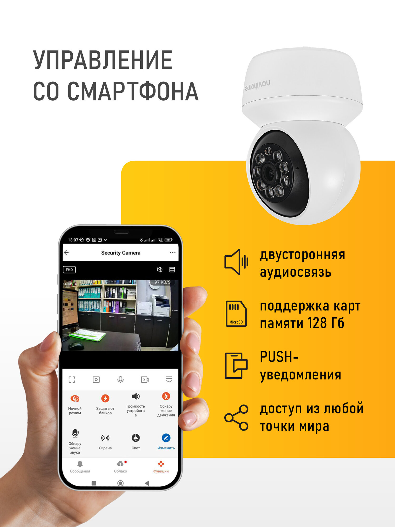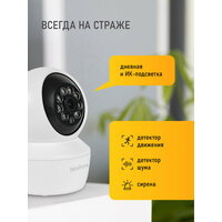 Камера предназначена для круглосуточного внутреннего наблюдения и оснащена для этого всем необходимым: слотом для карт памяти Micro SD, ИК-подсветкой и механическим ИК-фильтром для работы ночью, микрофоном и динамиком для организации двусторонней связи. Поворотный механизм позволяет организовать патрулирование территории, а связка высокопроизводительного процессора и мегапиксельного сенсора позволяет получить изображение высокого качества. Благодаря встроенному Wi-Fi модулю легко организовать беспроводное подключение. Простота настройки и доступ к камере из любой точки мира предоставляется бесплатным облачным сервисом. Камера может быть установлена в местах где необходимо изменять точку обзора и следить за перемещениями, при этом не теряя качества изображения: складах, офисах, торговых центрах и магазинах.