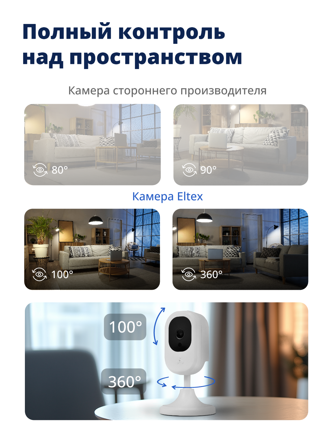 Какие еще функции есть у умной камеры? Настраивайте запись видео по расписанию или по движению в кадре и снимайте, когда это действительно нужно. Wi-Fi камера отлично встраивается в систему умного дома Eltex. Создавайте персональные сценарии совместной работы умных устройств или выбирайте готовые из 10+ шаблонов. Теперь за климат, охрану и контроль отвечает умный дом.