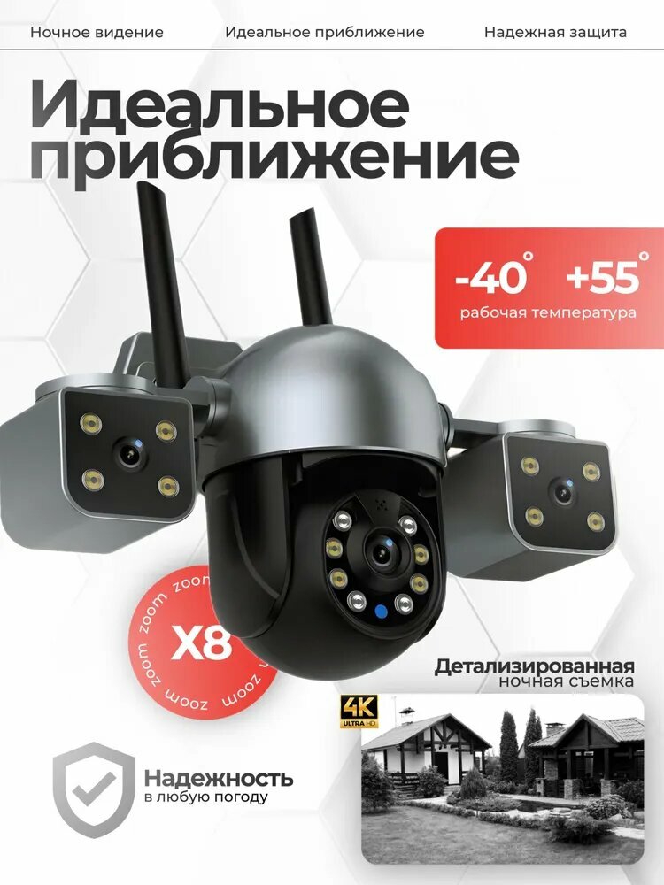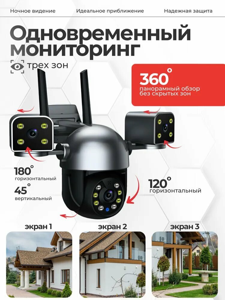 Камера видеонаблюдения уличная, выполненная в темно-сером цвете, оснащена тремя объективами и работает по Wi-Fi. Камера видеонаблюдения уличная оснащена тремя объективами, что позволяет охватывать большую территорию и получать более детальное изображение. Это обеспечивает более широкий угол обзора и позволяет контролировать большую площадь. Темно-серый цвет камеры видеонаблюдения уличной делает ее незаметной на фоне окружающей среды, что позволяет избежать привлечения внимания и обеспечивает безопасность. Wi-Fi подключение камеры видеонаблюдения уличной обеспечивает легкость установки и настройки. Вам не придется прокладывать провода или устанавливать дополнительное оборудование. Просто подключите камеру к сети Wi-Fi и начните наблюдение. В комплект поставки камеры видеонаблюдения уличной входит провод питания, руководство по использованию и все необходимые аксессуары для установки. Выбирая камеру видеонаблюдения уличную, вы получаете надежное и качественное решение для обеспечения безопасности вашего дома или бизнеса.