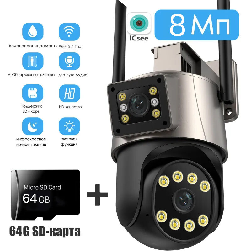 Камера видеонаблюдения Wi-fi, С картой памяти 64 Гб 8Mп/ Двойной объектив, двойной экран, Поворотная / Уличная, APP: ICsee(Русский)