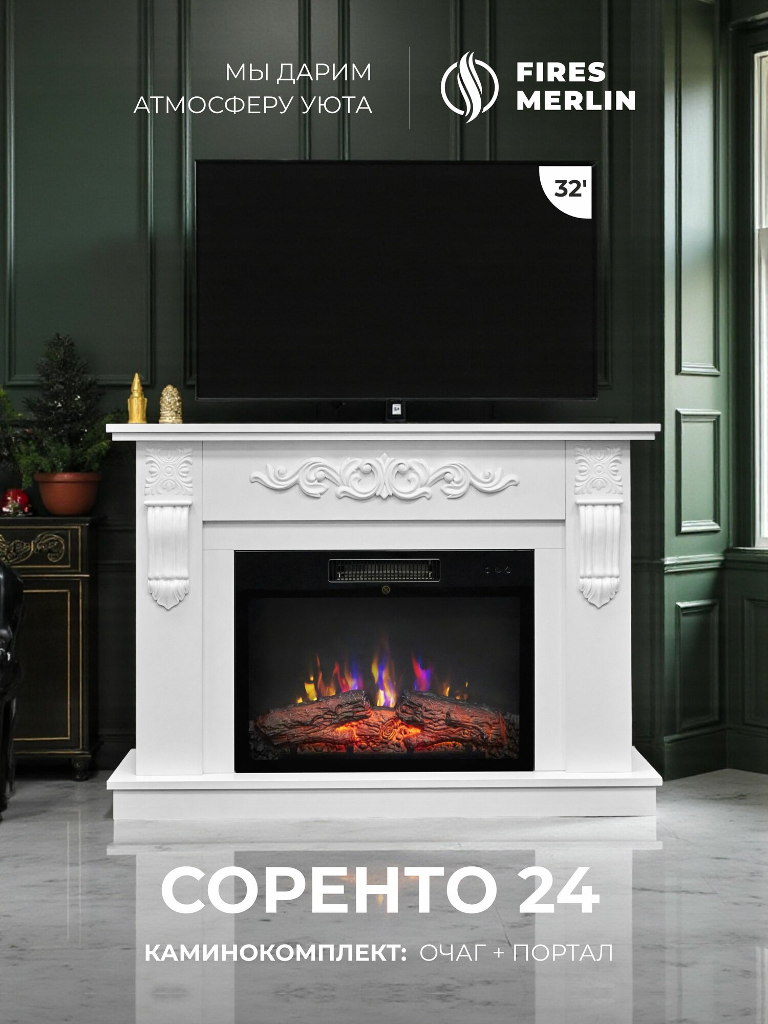 Камин электрический напольный Fires Merlin Соренто 24 белый c очагом, эффект звука потрескивания дров, живого пламени: сравнение цен, характеристики, фото, актуальное наличие и цены.