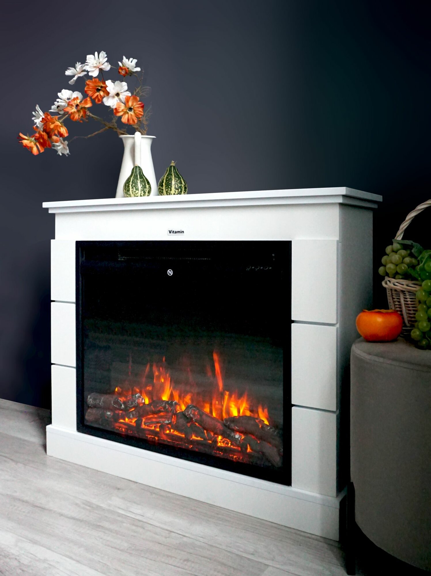 Купить Камин электрический с белым порталом VITAMIN. Цвет «Белый», с пультом ДУ, два режима обогрева, подсветка с доставкой по всей России.