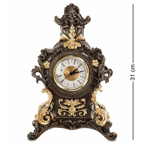 Часы сделаны из темного полистоуна и богато украшены позолотой. В центре находится классический круглый циферблат белого цвета с золотистым кружком в центре. Время показывают старинные черные стрелки. Часы будут отлично смотреться в любой комнате, обставленной в старинном стиле.