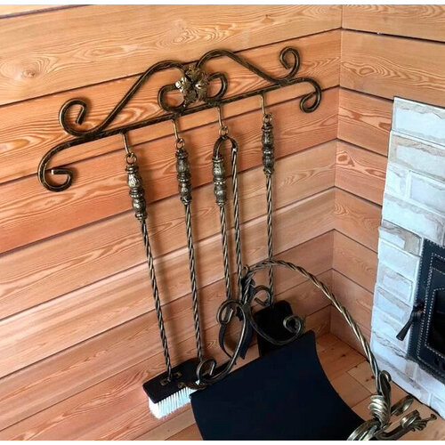 Настенный набор из 4 предметов идеально подойдет для тех, кто предпочитает альтернативу напольному хранению аксессуаров для камина. Конструкция навесного типа несомненно украсит любую поверхность, кирпичную кладку или бревенчатую стену. Изделие может использоваться не только внутри помещений, но и в уличных мангальных зонах, беседках, так как не боится коррозии и механических повреждений. Длина изделий 70 см.