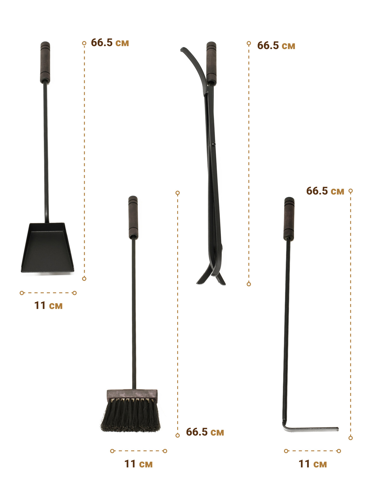 Габариты каминного набора в собранном виде: ширина: 20 см, глубина: 17 см, высота: 70 см. В набор входит: кочерга: 66,5 см./11 см, щетка: 66,5 см./11 см, совок: 66,5 см./11 см, щипцы: 66,5 см. Напольный каминный набор "Александр". Набор для камина не только прекрасно впишется в интерьер, но и и практичен в использовании. Это важный атрибут загородного дома, бани или приусадебного участка. Станет вам помощником по обслуживанию очага и камина. Занимает немного места и станет дополнением к вашему интерьеру, идеально подходит к стилю лофт. Каминные наборы покупают не только обладатели каминов, работающих на дровах, но даже те, у кого дома стоят электрические камины. А все потому, что эти аксессуары как нельзя лучше способствуют созданию уютной атмосферы - убедитесь в этом на собственном опыте. В комплект каминного набора входит щетка для золы, совок, кочерга и щипцы для поленьев, закрепленные на изящной устойчивой подставке. Каждый элемент окрашен порошковой краской, что способствует надежности и долговечности.