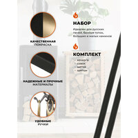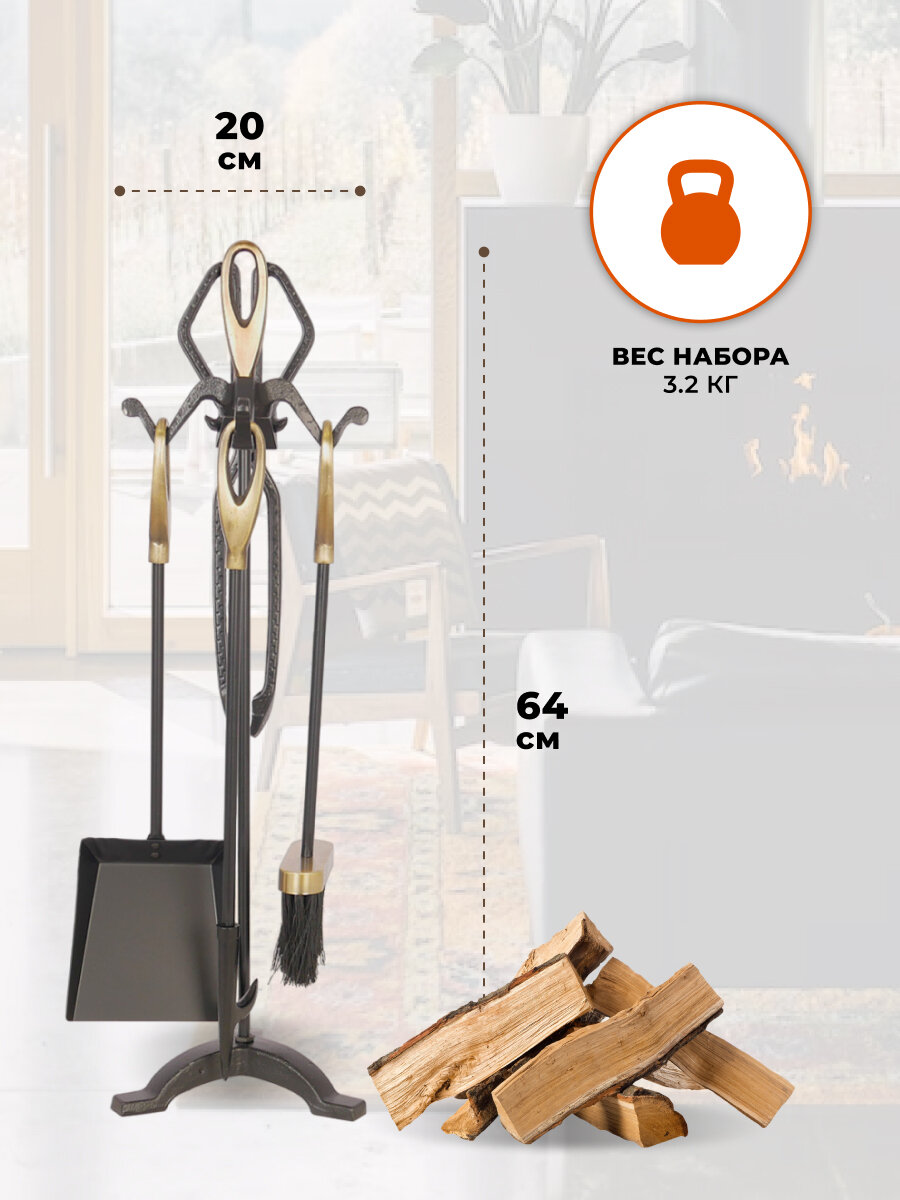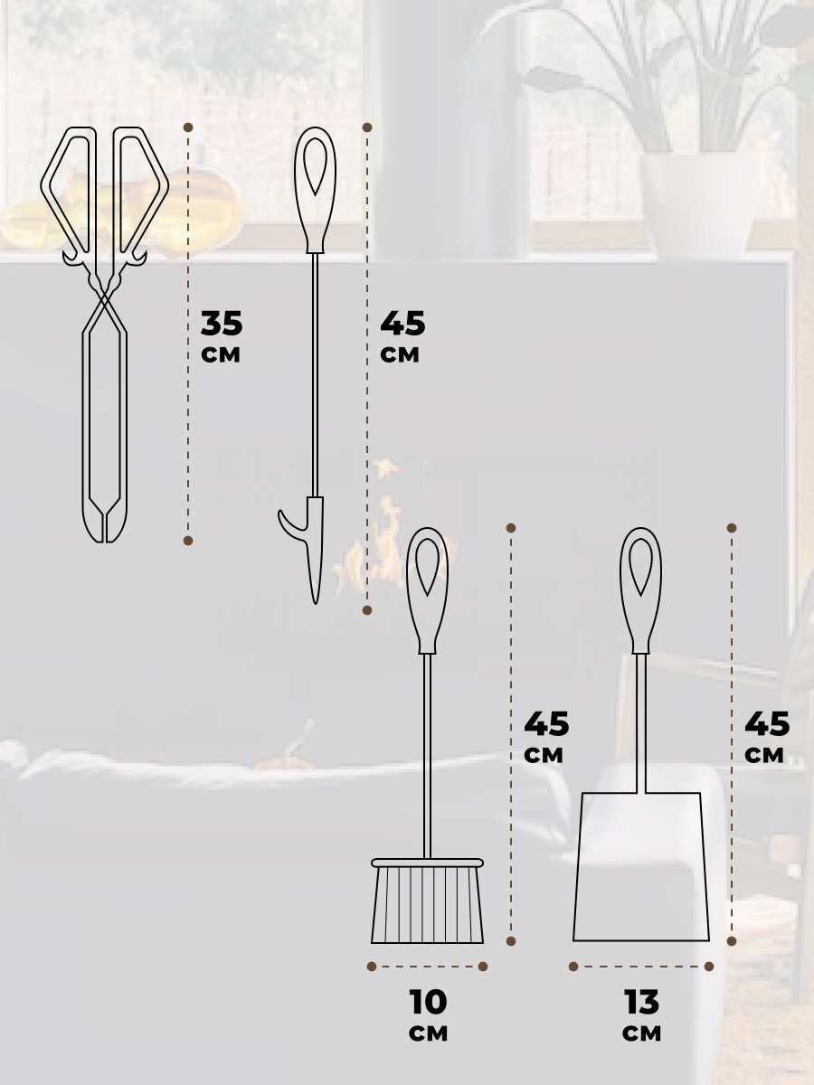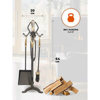 Габариты каминного набора в собранном виде: ширина: 20 см, глубина: 20 см, высота: 64 см. В набор входит: кочерга: 45 см, щетка: 45 см./10 см, совок: 45 см./13 см, щипцы: 35 см. Каминный набор - это стильный аксессуар предназначен для ухода за очагом. Он отлично вписывается в любой интерьер и удобен в использовании. Наборы для камина R-sauna отличаются высоким качеством и надежностью. Данная модель изготовлена из высококачественной стали. В набор для чистки камина входят: щетка и совок, для того чтобы убирать мелкий мусор и золу, щипцы для того, чтобы подбирать упавшие угли и возвращать их в камин, кочерга, для того чтобы поправлять поленья, а также подставка для хранения всех этих принадлежностей для камина. Каминный набор / Набор для камина / Набор для печи / Набор для мангала/ Печной набор