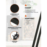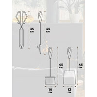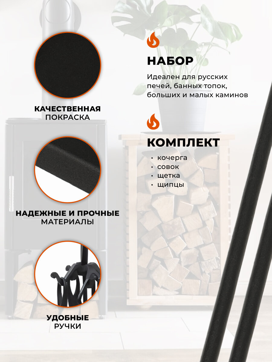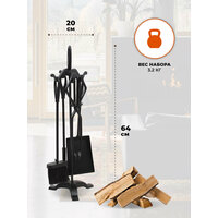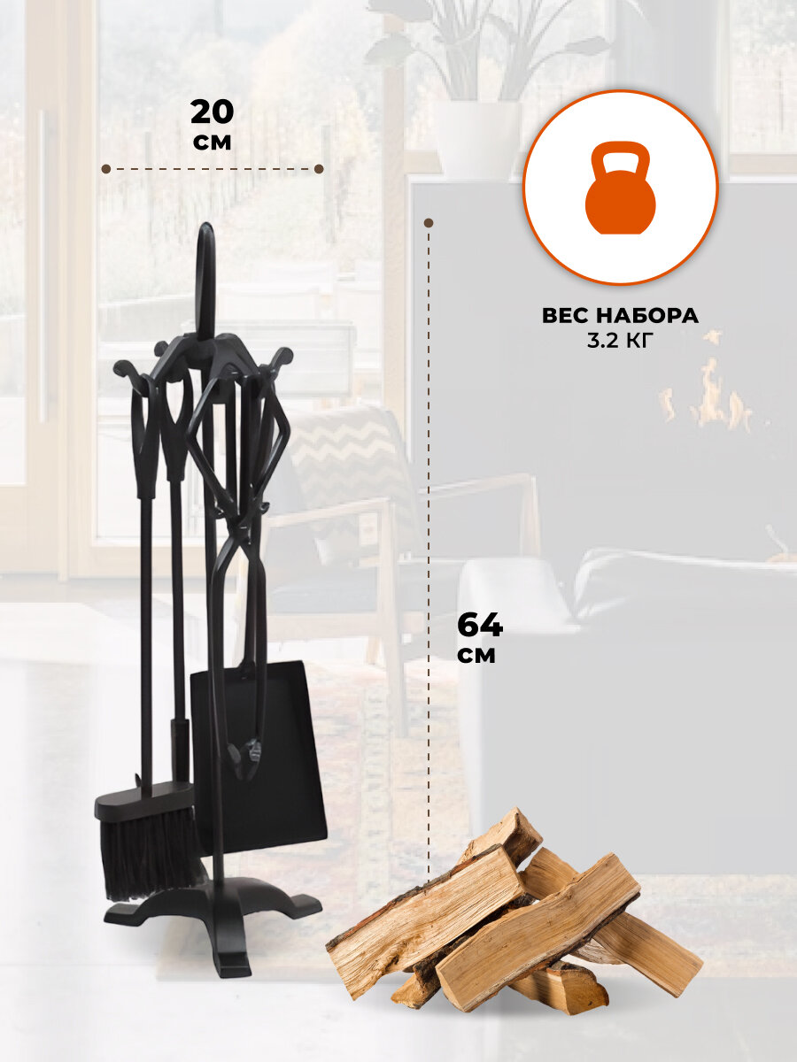Габариты набора в собранном виде: ширина: 20 см, глубина: 20 см, высота: 64 см. В набор входит: кочерга: 45 см, щетка: 45 см./10 см, совок: 45 см./13 см, щипцы: 35 см. Каминный набор - это стильный аксессуар предназначен для ухода за очагом. Он отлично вписывается в любой интерьер и удобен в использовании. Наборы для камина R-sauna отличаются высоким качеством и надежностью. Данная модель изготовлена из высококачественной стали. В набор для чистки камина входят: щетка и совок, для того чтобы убирать мелкий мусор и золу, щипцы для того, чтобы подбирать упавшие угли и возвращать их в камин, кочерга, для того чтобы поправлять поленья, а также подставка для хранения всех этих принадлежностей для камина. Каминный набор / Набор для камина / Набор для печи / Набор для мангала/ Печной набор
