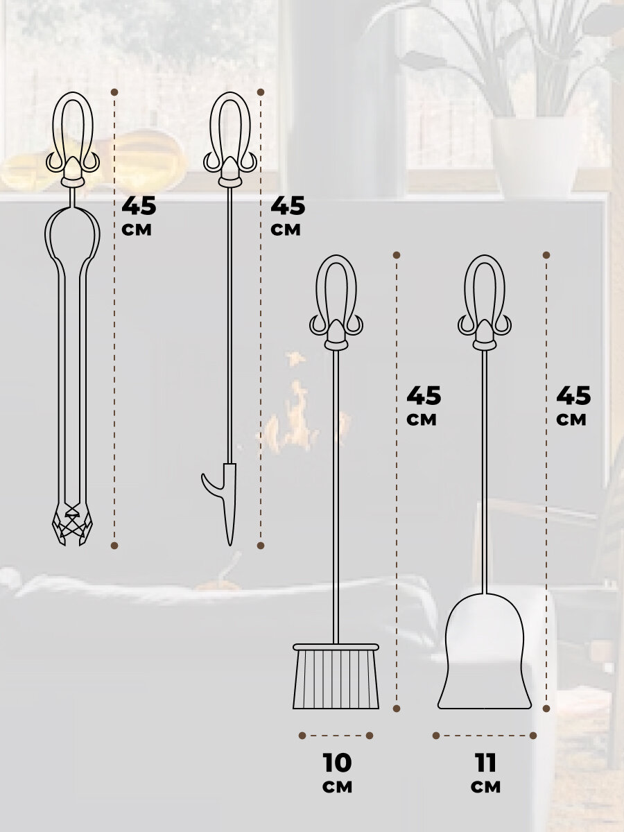 Габариты каминного набора в собранном виде: ширина: 20 см, глубина: 20 см, высота: 64 см. В набор входит: кочерга: 45 см, щетка: 45 см./10 см, совок: 45 см./11 см, щипцы: 45 см. Каминный набор - это стильный аксессуар предназначен для ухода за очагом. Он отлично вписывается в любой интерьер и удобен в использовании. Наборы для камина R-sauna отличаются высоким качеством и надежностью. Данная модель изготовлена из высококачественной стали. В набор для чистки камина входят: щетка и совок, для того чтобы убирать мелкий мусор и золу, щипцы для того, чтобы подбирать упавшие угли и возвращать их в камин, кочерга, для того чтобы поправлять поленья, а также подставка для хранения всех этих принадлежностей для камина. Каминный набор / Набор для камина / Набор для печи / Набор для мангала/ Печной набор
