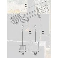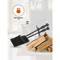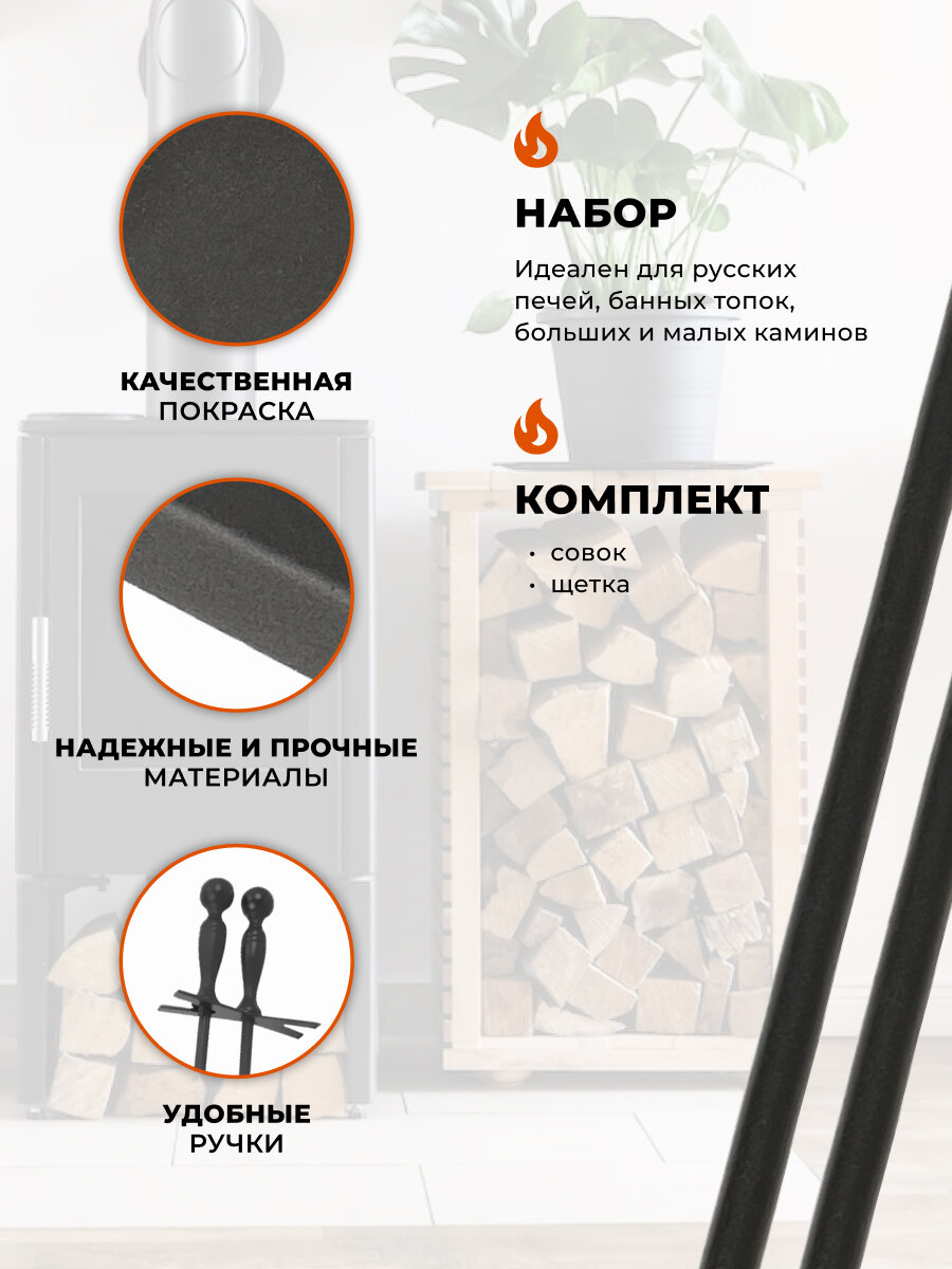 В набор входит: щетка: 37 см./10 см, совок: 37 см./12,5 см. Каминный набор - это стильный аксессуар предназначен для ухода за очагом. Он отлично вписывается в любой интерьер и удобен в использовании. Наборы для камина R-SAUNA отличаются высоким качеством и надежностью. Данная модель изготовлена из высококачественной стали. В набор для чистки камина входят: щетка и совок, для того чтобы убирать мелкий мусор и золу, щипцы для того, чтобы подбирать упавшие угли и возвращать их в камин, кочерга, для того чтобы поправлять поленья, а также подставка для хранения всех этих принадлежностей для камина. Каминный набор / Набор для камина / Набор для печи / Набор для мангала/ Печной набор