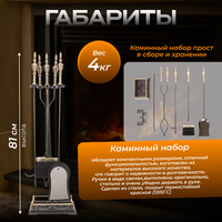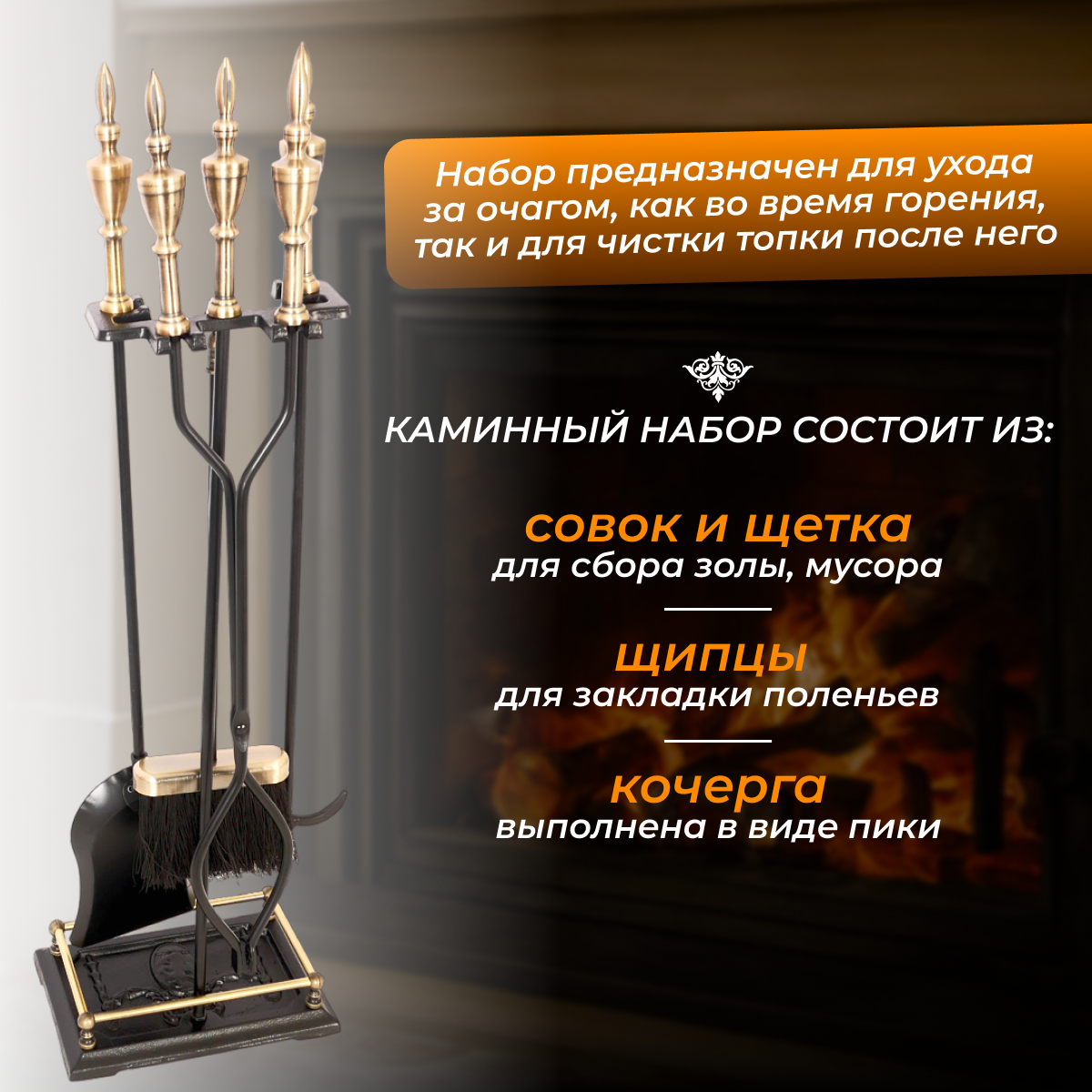 Набор каминный состоит из самых востребованных и необходимых при протопке печи и камина аксессуаров. Ручки предметов надежно защищены от нагрева. Стойка с креплением позволит хранить аксессуары компактно и удобно.