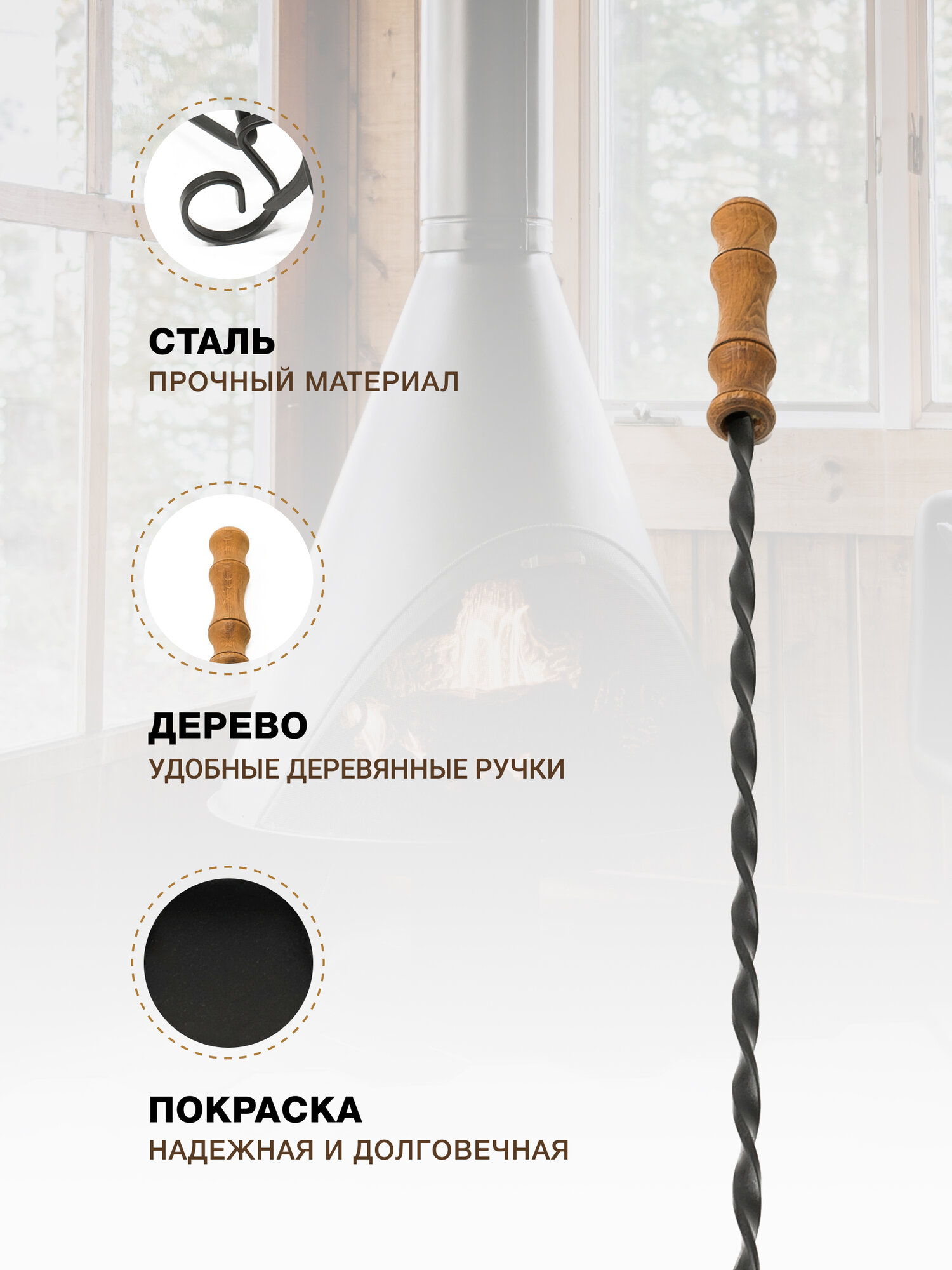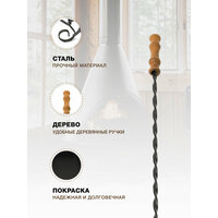Габариты каминного набора в собранном виде: ширина: 26 см, глубина: 26 см, высота: 77,5 см. В набор входит: кочерга: 73 см./12,5 см, щетка: 75 см./11 см, совок: 74 см./11 см, щипцы: 74 см. Напольный каминный набор "Пика". Набор для камина не только прекрасно впишется в интерьер, но и практичен в использовании. Это важный атрибут загородного дома, бани или приусадебного участка. Станет вам помощником по обслуживанию очага и камина. Занимает немного места и станет дополнением к вашему интерьеру. Каминные наборы покупают не только обладатели каминов, работающих на дровах, но даже те, у кого дома стоят электрические камины. А все потому, что эти аксессуары как нельзя лучше способствуют созданию уютной атмосферы - убедитесь в этом на собственном опыте. В комплект каминного набора входит щетка для золы, совок, кочерга и щипцы для поленьев, закрепленные на изящной устойчивой подставке. Ручка каждого аксессуара выполнена из ценных пород дерева. Каждый элемент окрашен порошковой краской, что способствует надежности и долговечности.