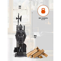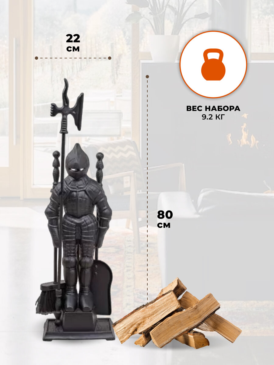 Габариты каминного набора в собранном виде: ширина: 22 см, глубина: 13 см, высота подставки в виде рыцаря 59 см./ высота вместе с копьем - 78 см. В набор входит: кочерга: 76 см, щетка: 50 см./10 см, совок: 52 см./10 см, щипцы: 54 см. Каминный набор - это стильный аксессуар предназначен для ухода за очагом. Он отлично вписывается в любой интерьер и удобен в использовании. Наборы для камина R-sauna отличаются высоким качеством и надежностью. Данная модель изготовлена из высококачественной стали. В набор для чистки камина входят: щетка и совок, для того чтобы убирать мелкий мусор и золу, щипцы для того, чтобы подбирать упавшие угли и возвращать их в камин, кочерга, для того чтобы поправлять поленья, а также подставка для хранения всех этих принадлежностей для камина. Каминный набор / Набор для камина / Набор для печи / Набор для мангала/ Печной набор