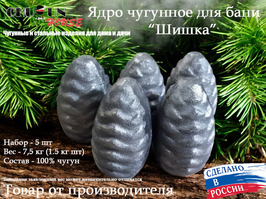 Чугунные шишки в виде кедровой шишки для бани изготовлены из экологически чистого материала - чугуна. Этот материал обладает высокой теплопроводностью, что позволяет ему быстрее набирать тепло и разогревать баню в 2 раза быстрее, чем обычные камни.