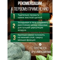 Перед использованием тщательно промыть камни под проточной водой (при необходимости использовать щетку) и высушите камни для бани. Уложить камни, таким образом чтобы воздух свободно циркулировал. Крупные камни уложите внизу, мелкие на поверхности.