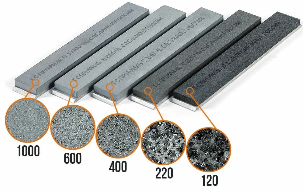Набор абразивных камней Профиль. В набор входит 5 абразивов на алюминиевых бланках. Абразивы для заточки ножей Профиль - универсальные камни из карбида кремния, которые подходят для заточки большинства марок сталей. В наборе камней для заточки Профиль собраны абразивы различной зернистости: от 120 до 1000 грит. Такого набора будет достаточно для всех видов работ, от обдирки до финального шлифования.Дополнительно в набор входит сумка-чехол для хранения камней.