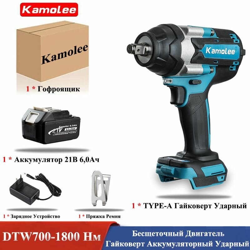 Купить Kamolee DTW700 1800Нм 1/2 Дюйма Гайковерт Бесщеточный Ударный Электрический (1 АКБ 6,0Ач, Гофроящик) с доставкой по всей России.