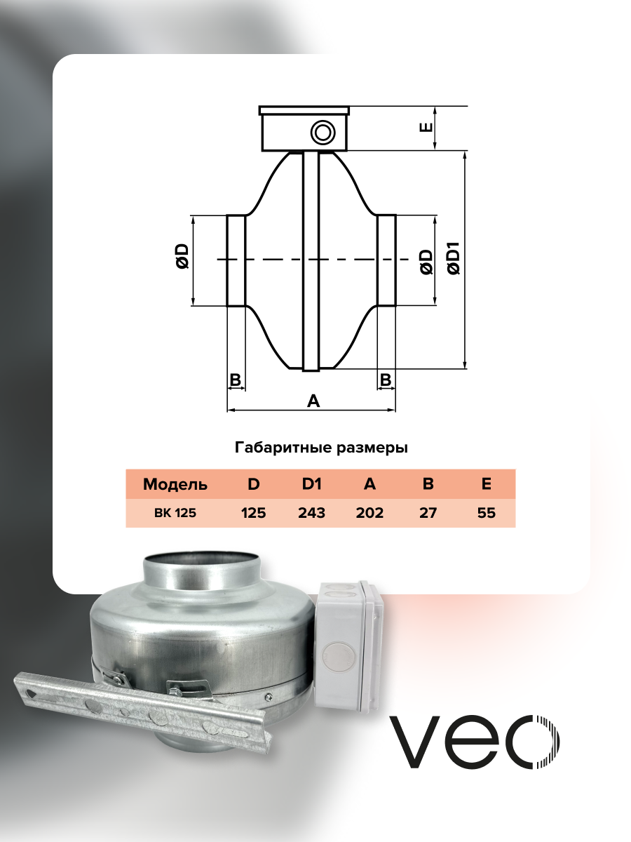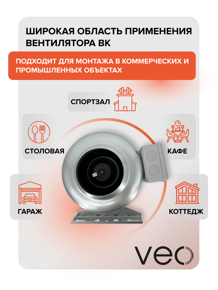 Канальный вентилятор приточно-вытяжной BK 125 центробежный, диаметр 125 мм, 340 м3/ч, 64 Вт, оцинкованная сталь, VEO: сравнение цен, характеристики, фото, актуальное наличие и цены.