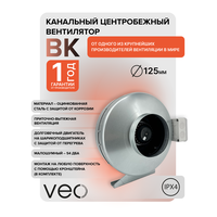 Купить Канальный вентилятор приточно-вытяжной BK 125 центробежный, диаметр 125 мм, 340 м3/ч, 64 Вт, оцинкованная сталь, VEO с доставкой по всей России.