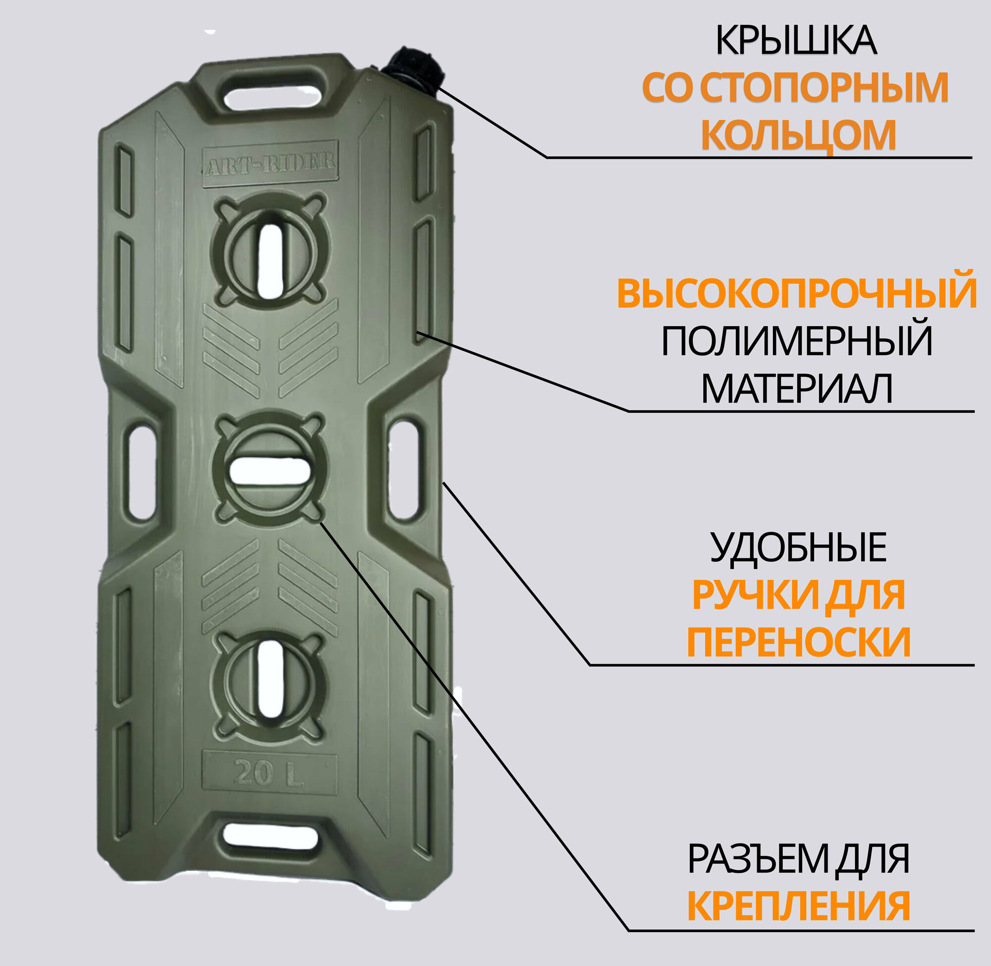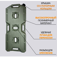 Канистра на 15 литров отлично подходит для транспортировки благодаря своей удобной плоской форме. Поместится в любом автомобиле или квадроцикле. Со всех сторон у канистры есть специальные ручки, что позволяет брать её из любого положения и не марать при этом руки. Имеются 3 отверстия для крепежа.