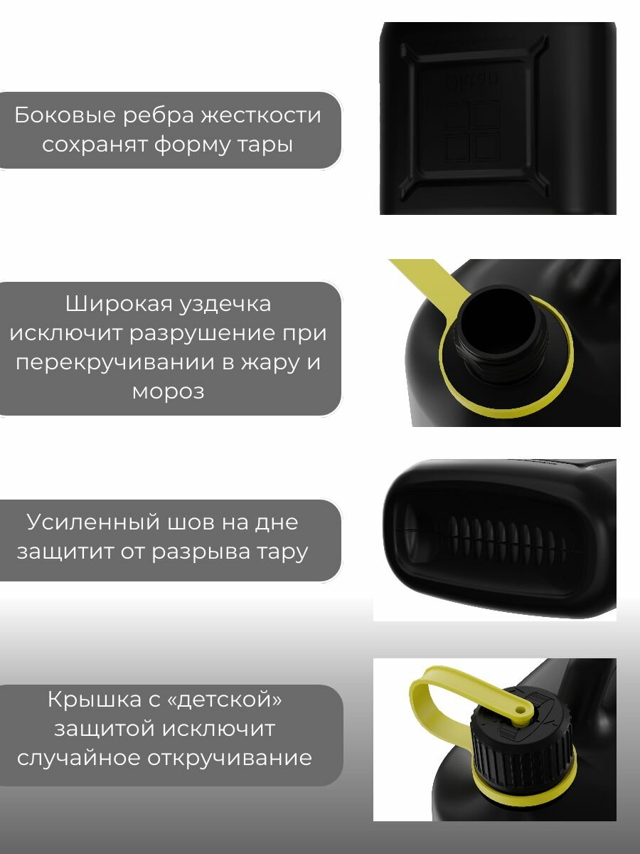 Все канистры снабжены крышкой с замком, предотвращающим случайное открытие и гибким гофрированным носиком, с системой "антибульк", для удобной заливки топлива через горловину бензобака автомобиля.