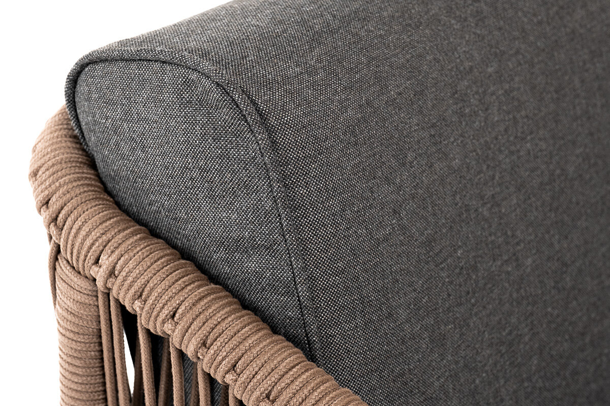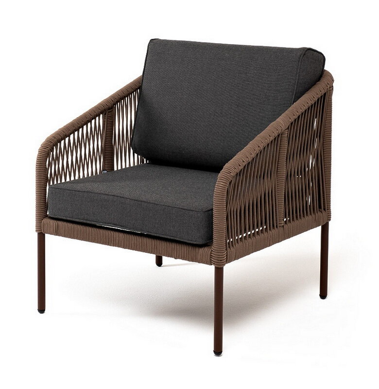 «Канны» кресло плетеное из роупа, каркас алюминий коричневый (RAL8016) муар, роуп коричневый круглый, ткань темно-серая 027