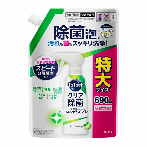 KAO Средство для мытья посуды "CuCute Clear" (с лимонной кислотой и ароматом лимона и лайма / пена-спрей для мытья без губки) 690 мл предназначено для эффективного удаления стойких загрязнений и неприятных запахов с различной кухонной утвари. Этот спрей делает процесс мытья посуды проще и быстрее, особенно в случаях, когда губка может не справиться.
