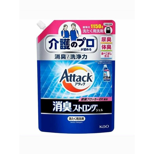 KAO Жидкое средство для стирки Attack Deodorizing Strong с усиленным дезодорирующим эффектом, с ароматом свежей травы, мягкая упаковка с крышкой 1150 г для переливания в флакон с мерным колпачком.