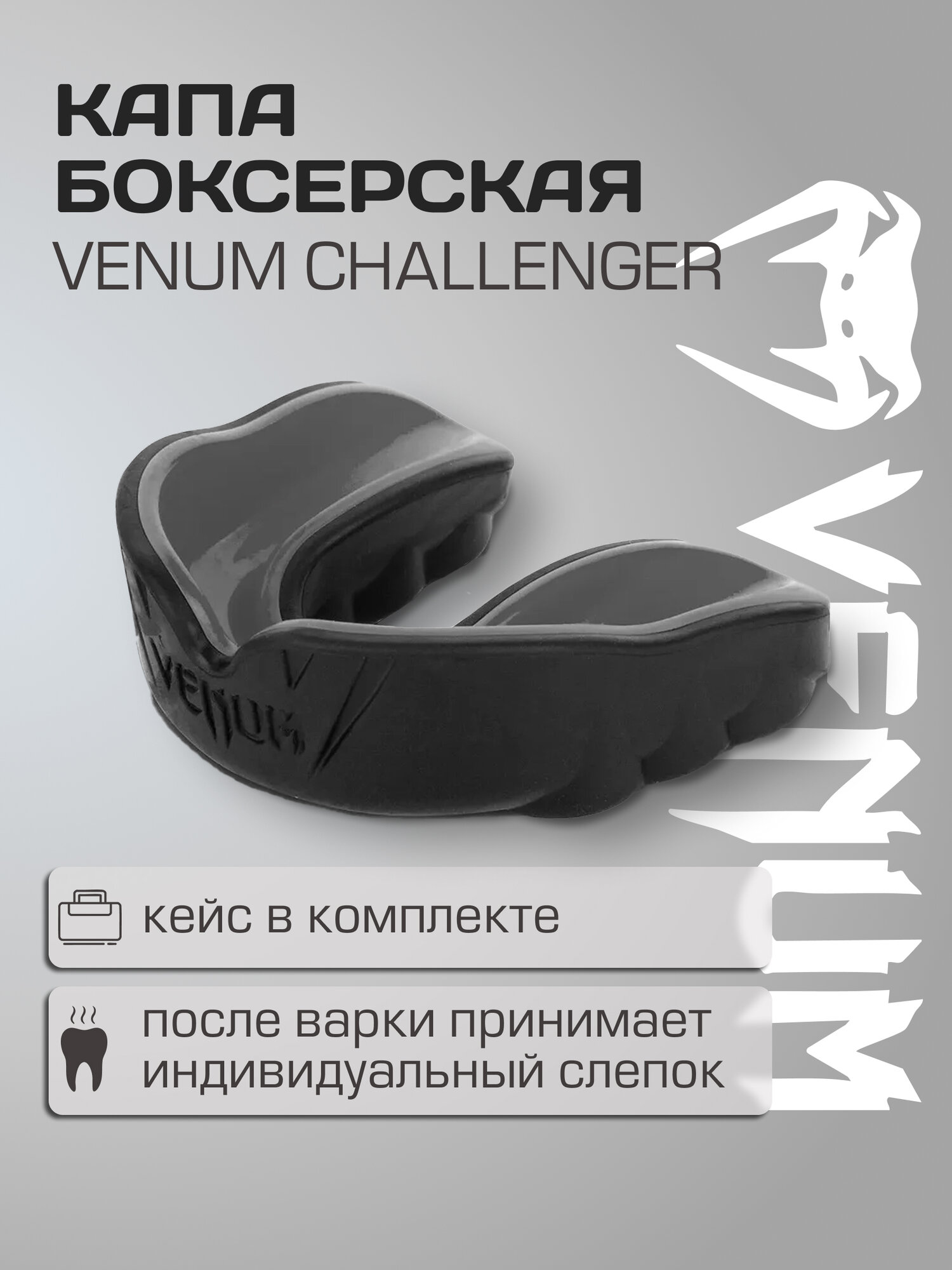 Капа боксерская Venum Challenger черно-серая, Senior, с чехлом, арт. VENUM-0618-114: сравнение цен, характеристики, фото, актуальное наличие и цены.