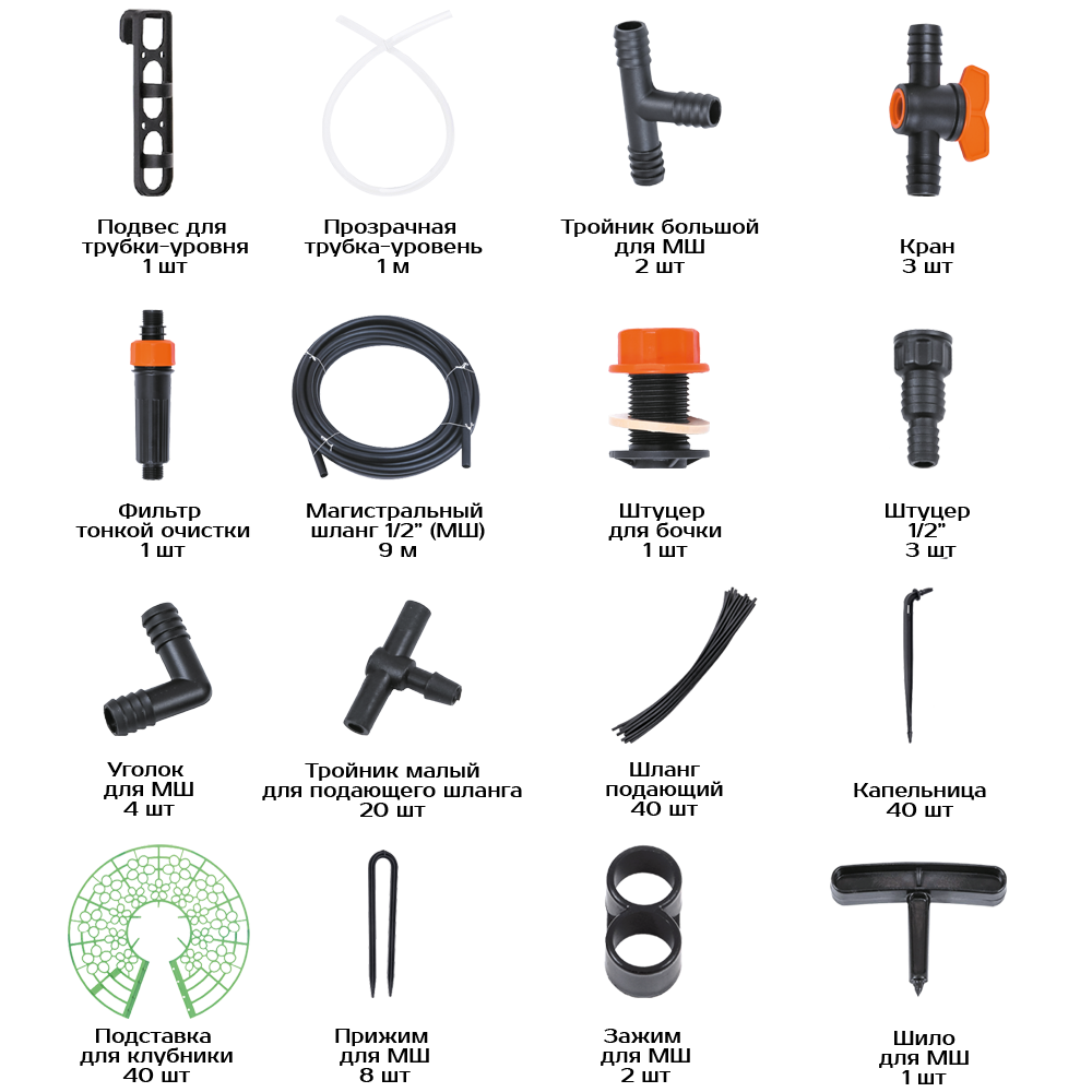 | Комплектация | штуцер присоединения к емкости - 1 шт., шланг магистральный 18 м - 1 шт., трубка уровень прозрачная 1 м - 1 шт., подвес для трубки уровня - 1 шт., шланг подающий 40 см - 60 шт., капельницы - 60 шт., тройник малый - 30 шт., кран - 3 шт., уголок для магистрального шланга - 3 шт., тройник большой - 3 шт., заглушка для магистрального шланга - 3 шт., прижим для магистрального шланга - 16 шт., шило для магистрального шланга - 1 шт., штуцер 1/2" - 3 шт., фильтр тонкой очистки - 1 шт. |
