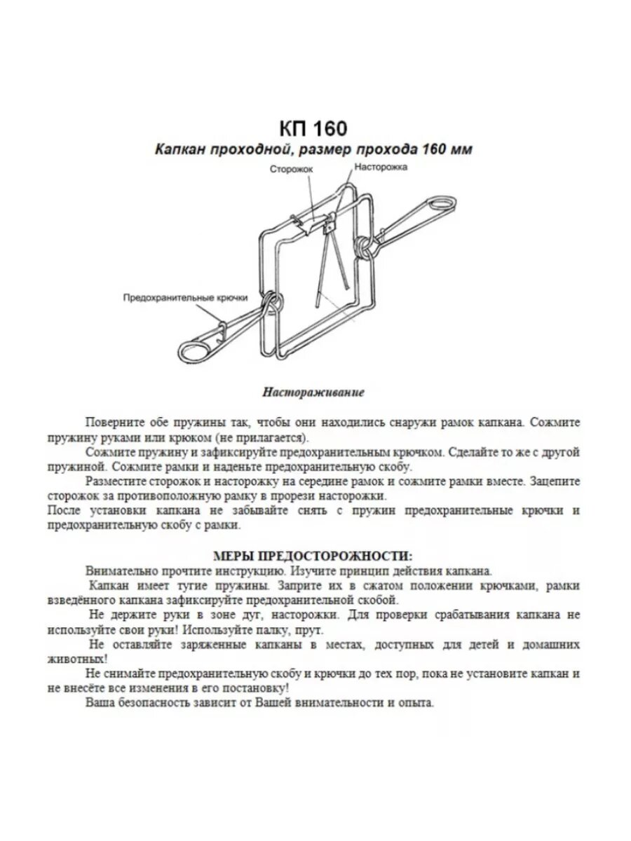 Капкан проходной гуманный КП 160. Разрешен для промысла в РФ (0108). Капкан проходной, размер прохода 160 мм. Работает в обе стороны. Вес 1шт 0,65 кг. Капкан предназначен для отлова соболя, куницы, норки, хоря, ондатры и других некрупных животных. Настораживание: Поверните обе пружины так, чтобы они находились снаружи рамок капкана. Сожмите пружину руками или крюком (не прилагается). Сожмите пружину и зафиксируйте предохранительным крючком. Сделайте то же с другой пружиной. Сожмите рамки и наденьте предохранительную скобу. Разместите сторожок и насторожку на середине рамок и сожмите рамки вместе. Зацепите сторожок за противоположную рамку в прорези насторожки. После установки капкана не забывайте снять с пружин предохранительные крючки и предохранительную скобу с рамки. Гуманные ловушки разрешены к использованию на территории РФ согласно «Соглашению о международных стандартах на гуманный отлов диких животных между Европейским сообществом, Канадой и Российской Федерацией», ратифицированному Федеральным законом РФ от 26.04.2008г. № 52-ФЗ Охота на территории Российской Федерации должна осуществляться с соблюдением Правил охоты, утвержденных приказом Минприроды России от 24.07.2020 № 477