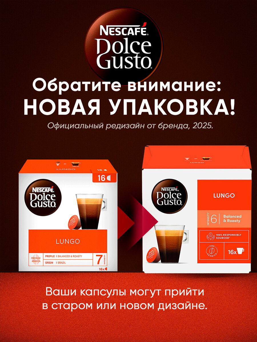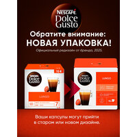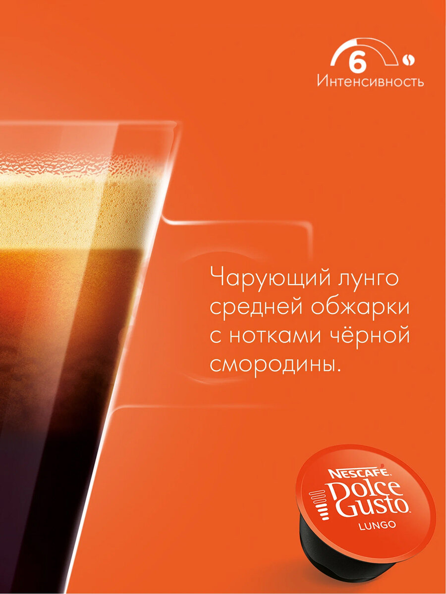 Упаковка кофе Nescafe Dolce Gusto Lungo содержит 16 капсул, предназначенных для капсульных кофемашин Nescafe Dolce Gusto.