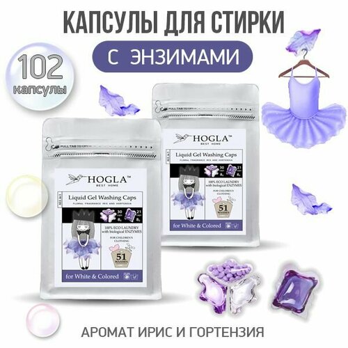 Бисер для стирки гипоаллергенный гель Ирис и Гортензия 51 стирка. Высококонцентрированный парфюмированный гель для стирки в капсулах . Это новый формат стирки. Стирает в 8 раз чище, чем обычное моющее средство. Доказано экспериментально. Больше не нужно задумываться о правильной дозировке, 1 капсула – 1 стирка. Капсулы предназначены для высококачественного ухода за одеждой, очищающее вещество проникает глубоко в волокна ткани, разрушая стойкие загрязнения. Универсальная очистка, легкая и удобная стирка. В капсулы добавлена ферментная формула, позволяющая дополнительно отстирывать белковые, трудновыводимые пятна. После стирки одежда приятна для кожи, мягкая, шелковистая. Применена инновационная технология Fragrance lock отборных микрокапсульных ароматов, когда чарующий аромат раскрывается при качании и трении одежды и держится 72 часа. В одной капсуле 100% экологически чистый состав. Гипоаллергенный, подходит для стирки детского нижнего белья с первых дней жизни. Капсулы эффективны в воде любой жесткости. Низкое пенообразование, позволяет не применять повторное ополаскивание, при этом экономится расход воды. Стирают при низких температурах от 20 °С, позволяя экономить на электроэнергии. Работают во всех видах стиральных машин. Не содержит фосфатов, фосфонатов, оптических отбеливателей, агрессивных компонентов, парабенов, хлора. Дополнительные свойства: 1. Содержат обеззараживающие вещества, обладают антибактериальной формулой длительного действия от бактерий и бельевых клещей. Дезинфекция 99,9%. 2. Обеспечивают деликатный и эффективный уход за белыми и цветными тканями, не разрушает структуру волокон. Ткани после многочисленных стирок сохраняют форму и насыщенность цвета. 3. Гель быстро разлагается на биологические составляющие, сливная вода в канализацию после стирки не наносит ущерба окружающей среде. 4. Продуманный дизайн, на внешнюю оболочку капсулы добавлен горький агент, чтобы дети или пожилые люди не съели красивую капсулу по ошибке. 5. Капсулы удобны для домашнего использования ( не нужно покупать тяжелые пачки порошка и бутылки гелей, кондиционеров и ароматизаторов), а так же для путешествий. Парфюмированные ароматы: созданы профессионалами Австралии специально для торговой марки HOGLA, применены передовые и чистые ингредиенты эфирных масел и цветочных композиций. Назначение: для белого и цветного белья, подходит для всех видов тканей, кроме изделий из шерсти и шелка.
